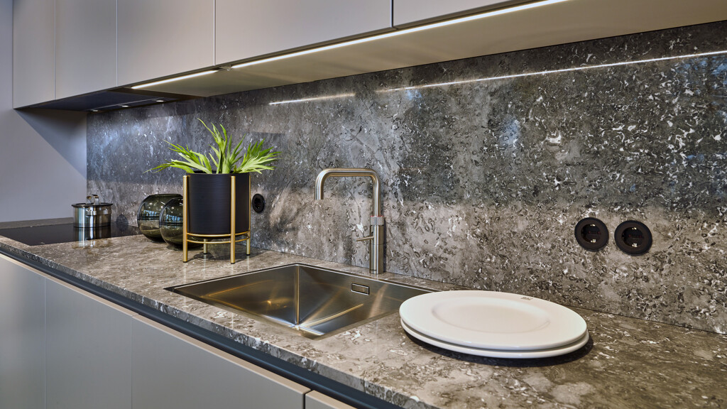 Eine Granit Arbeitsplatte hat ein einmaliges, ausdrucksstarkes und zeitloses Aussehen. Man sieht und fühlt die wunderbare Schönheit der Natur. Es ist robust, sehr hart und langlebig und äußerst kratz-, hitze- und fleckenbeständig und lässt sich ganz einfach mit Wasser und milder Seife reinigen. Die matte und geflammte Ausführung ist gegen Feuchtigkeit und Flecken etwas empfindlicher als die hochglanzpolierten Arbeitsplatten.