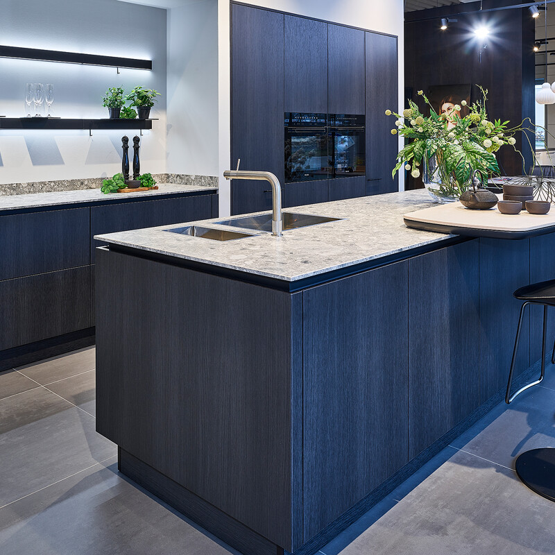 Eine schwarze Holzküche kombiniert die Wärme des Holzes mit dem kraftvollen Aussehen von Schwarz. Diese Art von Küche strahlt Stil und Charakter aus und passt perfekt in moderne und industrielle Einrichtungen. Die Holzstruktur hat außerdem den Vorteil, dass Fingerabdrücke kaum sichtbar sind. Die Designmarke next125 bietet seit kurzem ein durchgefärbtes schwarzes Eichenfurnier an, und unsere Marken Ballerina, Contur und SieMatic bieten Fronten in einer schwarzen Holzimitation an. Eine schwarze Küche aus Holz lässt sich wunderbar mit hellen Arbeitsplatten, goldenen oder kupfernen Akzenten und schwarzen Geräten zu einem harmonischen und eleganten Ganzen kombinieren. Entdecken Sie die Möglichkeiten für Ihre Traumküche in unserer Ausstellung!