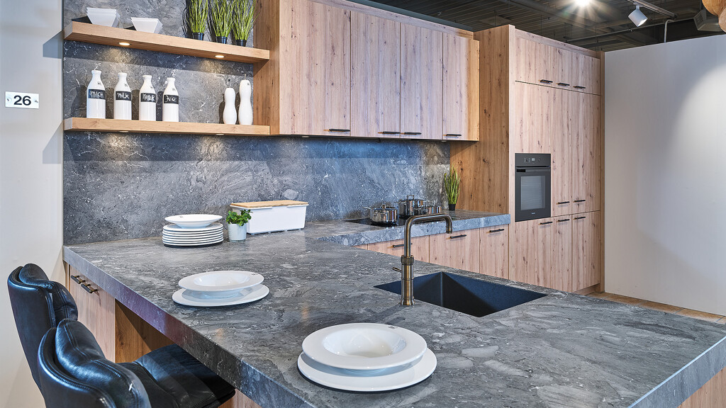 Eine Holzplatte als Bar auf einer Kücheninsel ist nicht nur ein schöner Blickfang, sondern auch ein funktionales Element in Ihrer Küche. Mit ein paar stilvollen Barhockern wird die Barplatte zum idealen Ort für Frühstück, Mittagessen oder geselliges Beisammensein beim Kochen. Massivholz oder Materialien in Holzoptik sorgen für einen warmen und einladenden Look, der sowohl zu modernen als auch zu klassischen Küchen passt. Kombinieren Sie die Barplatte mit anderen Holz-Akzenten zu einem harmonischen Ganzen. Lassen Sie sich von unseren Ideen für eine Küche mit einer Barplatte aus Holz inspirieren! Auf dieser Website oder besuchen Sie unsere beiden Ausstellungen in Nordhorn, die zusammen 10.000 m² Ausstellungsfläche und über 200 Ausstellungsküchen umfassen.