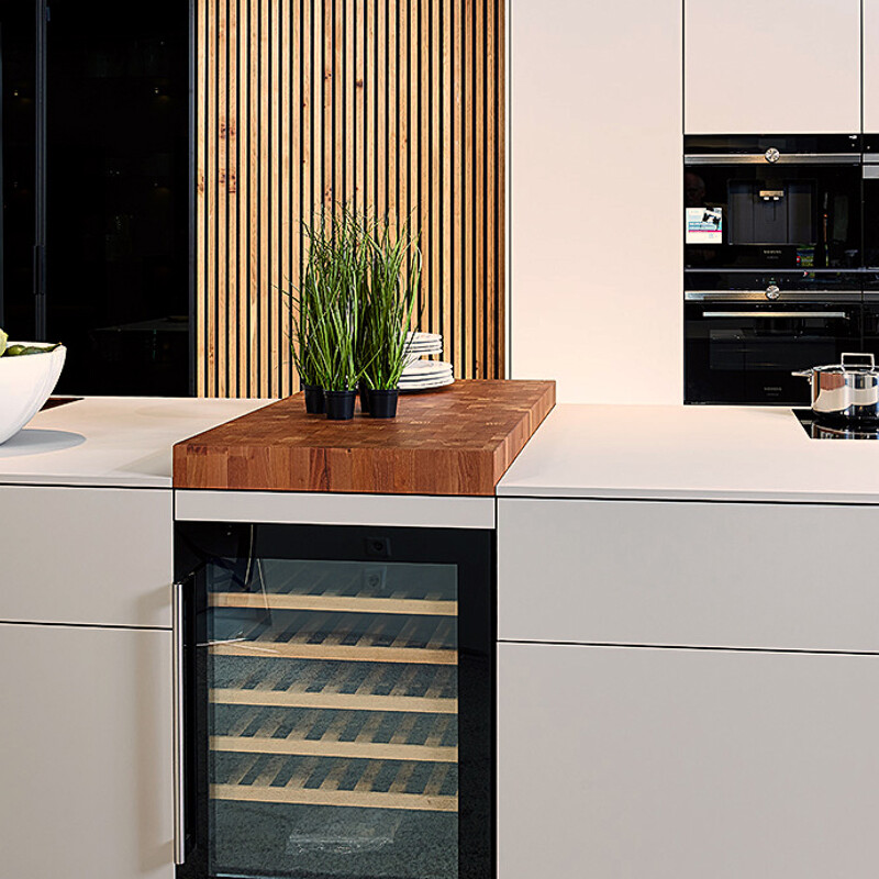 Obwohl eine massive Küchenarbeitsplatte aus Holz ein warmes und natürliches Aussehen hat, bringt sie mehr Nachteile als Vorteile mit sich. Das Material ist feuchtigkeits- und hitzeempfindlich, was zu Verformungen führen kann, und erfordert einen hohen Pflegeaufwand. Außerdem ist es anfällig für Kratzer und Flecken, die sich nur schwer entfernen lassen. Aus diesem Grund entscheiden sich unsere Kunden nur selten für eine echte Holz-Arbeitsplatte. Eine Küchenarbeitsplatte in Holzoptik aus Kunststoff ist natürlich eine tolle Option, aber wenn Sie echtes Holz bevorzugen, ist ein integrierter Massivholzblock, wie auf diesem Bild zu sehen, auch eine wunderbare Lösung. Dieser ist nicht nur nachhaltig und robust, sondern setzt auch einen markanten Akzent in der Küche. Außerdem bietet er die Möglichkeit, verschiedene Arbeitshöhen zu schaffen, was die Ergonomie in Ihrer Küche verbessert. Unsere Küchenspezialisten beraten Sie gerne!