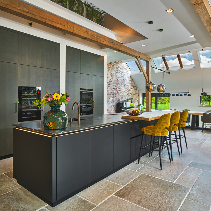 Eine Eichenholzküche ist dank der Robustheit, der warmen Ausstrahlung und der Vielseitigkeit von Eichenholz eine beliebte Wahl. Dieses nachhaltige Material ist von Natur aus stark und widerstandsfähig gegen Abnutzung, so dass es jahrelang schön bleibt. Eiche gibt es in verschiedenen Ausführungen: rustikale Eiche mit Ästen für einen robusten Look, fein selektierte Eiche für einen eleganten Look oder Balkeneiche für einen besonders natürlichen Look. Darüber hinaus kann Eiche geölt, gebeizt, geräuchert oder lackiert werden, so dass Farbe und Struktur perfekt zu Ihrem Einrichtungsstil passen. Von klassisch bis modern, eine Küche aus Eiche ist immer eine stilvolle Wahl. Hier sehen Sie eine Küche von next125 mit Fronten aus schwarzem Mattglas und graphitgrauer Eiche Select, die wir bei Kunden in Twente eingebaut haben.