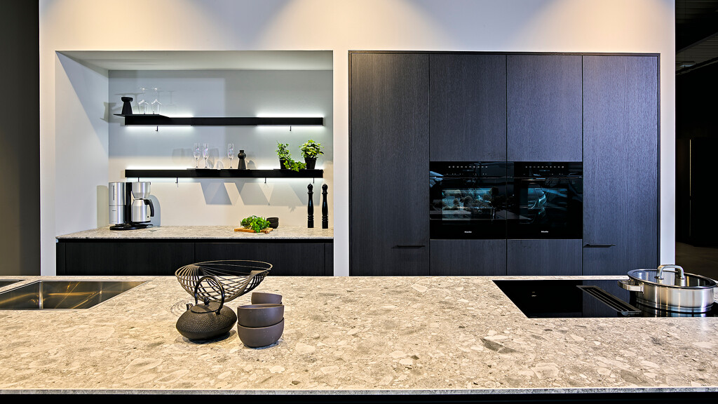 Die allererste SieMatic SLX der Welt steht in unser Ausstellung, sehen Sie sich diese Newsmeldung aus 2019 an. Diese Luxusküche mit Koch- und Spülinsel und einer Schrankwand ist in samtmattem, steingrauem SimiLaque ausgeführt. Typisch für SLX sind die geriffelten, beleuchteten Griffleisten unter der Küchenarbeitsplatte und zwischen den Schrankwandtüren. Die Insel dieser grifflosen Küche ist mit einer 6 mm dünnen Keramikarbeitsplatte des Typs Neolith Calatorao silk ausgestattet. Die Küche ist mit hochwertigen Geräten von Gaggenau, Siemens und BORA ausgestattet. Eine schwarze Silgranit-Spüle von Blanco mit schwarzem Quooker rundet diese Küche ab.