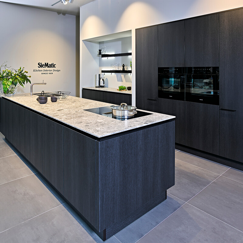 Diese schwarze SieMatic S2 Inselküche in Holznachbildung finden Sie in unserer Filiale Küchenland, Koje 54.