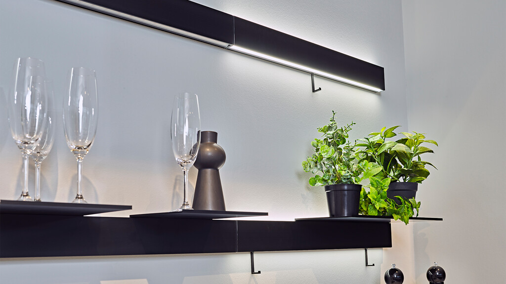 Ein wunderbares Beispiel für den Urban Lifestyle ist diese Küche in graphitgrauem, samtmattem Similaque. Similaque ist ein hochwertiges Laminat, das wie Mattlack aussieht, aber deutlich robuster und stärker ist. Die Arbeitsplatte dieser grifflosen SieMatic Küche besteht aus Granit in der Ausführung Nero Assoluto Zimbabwe matt. Typisch für den Urban Lifestyle ist das Standelement, in diesem Fall aus Nussbaum, mit einer Rinne für Kräuter, Flaschen und andere Küchenutensilien. Die Schrankwand besteht teilweise aus beleuchteten Vitrinenschränken mit breiten Metallrahmen und Glas in der Farbe Parsol bronce. In diesem Fall wird die Insel als Halbinsel platziert, aber sie kann natürlich auch frei im Raum stehen. Die Küche ist mit Miele Einbaugeräten, einem BORA-X Pure Kochfeld und einem Quooker ausgestattet.