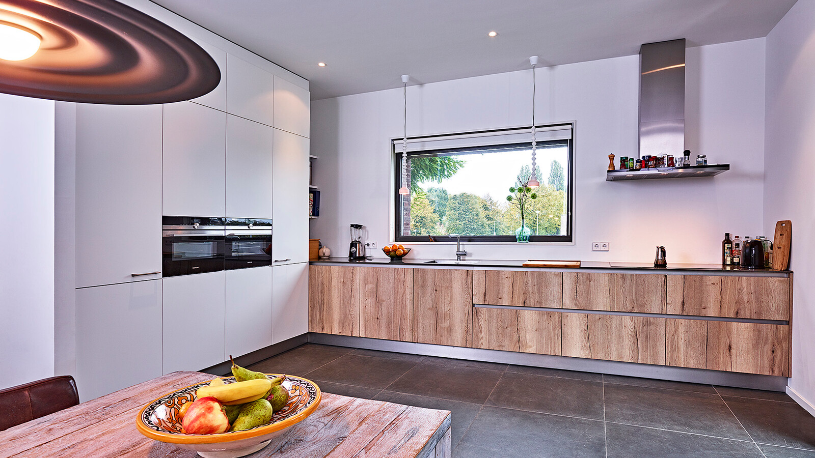 Diese L-Küche oder Eck-Küche von Contur ist so einfach wie stilvoll. Der hohe, weiße Wandschrank mit Fronten aus samtmattem Lacklaminat reicht bis an die Decke und ist komplett symmetrisch. Eingebaut sind eine Kombi-Mikrowelle, ein Dampfgarer, ein Kühlschrank und ein Gefrierschrank. Die Fronten der Unterschränke sind aus einer Alteiche Provence Nachbildung. Die glänzende Arbeitsplatte besteht aus 12 mm dickem Komposit, Silestone Altair. Alle Einbaugeräte in dieser Küche kommen von Siemens.