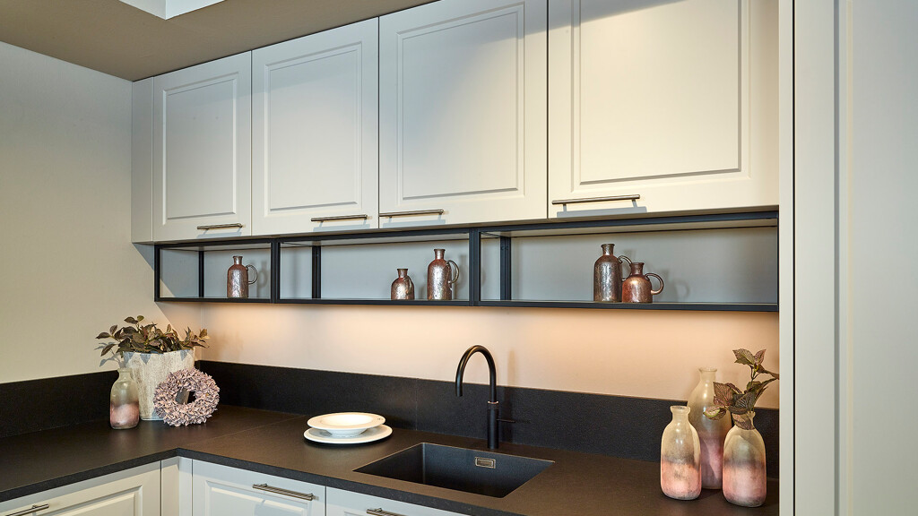 Wertvoll, auffallend, opulent, elegant und repräsentativ. Mit diesen Begriffen definiert die Luxusmarke SieMatic die Serie Classic. Eine Eckküche mit auffallenden Stilelementen wie Edelstahl Facettenfronten, in Hochglanz lackiertes Nussholz und Vitrinen Oberschränken. Diese Küche ist in unserer Ausstellung Küchenland zu sehen.