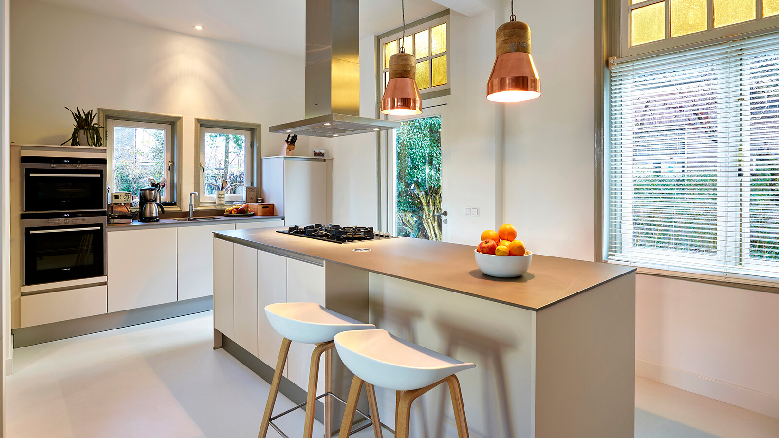 Eine Küche mit Insellösung ist ein Traum für viele Kochbegeisterte. Eine Insel oder Halbinsel verleiht Ihrer Küche ein einzigartiges Aussehen und ist außerdem sehr praktisch. Das Bild zeigt eine Inselküche von Contur mit einer Keramikarbeitsplatte in Betonoptik. Wir dürften diese Küche in einer ehemaligen Kirche auf einer der Watteninseln installieren.