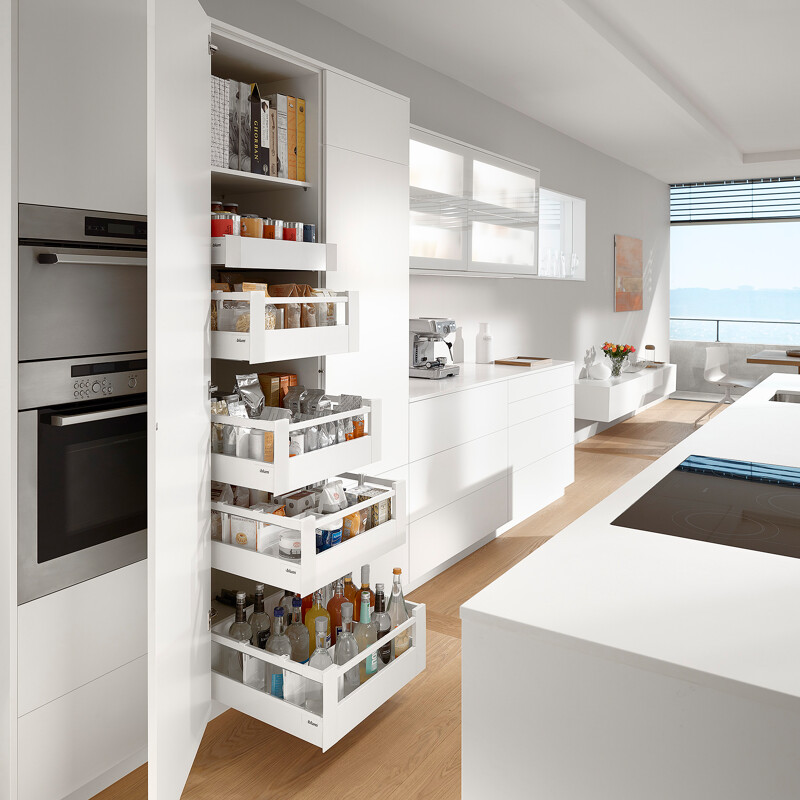Hier zeigen wir den Space Tower von Blum, einem österreichischen Hersteller von Beschlägen und Schranksystemen. Viele große Küchenhersteller arbeiten mit diesem innovativen Unternehmen zusammen. Die leichtgängigen Schubladen sind voll ausziehbar und können jeweils 70 kg tragen. All Ihre Vorräte sind übersichtlich angeordnet, leicht zu finden und von oben zugänglich. Der Schrank ist flexibel in Höhe, Breite und Tiefe, es gibt verschiedene Arten von Schubladen sowie Elemente zur Anordnung in der Schublade. Damit Ihre Mehltüten nicht umfallen, zum Beispiel...