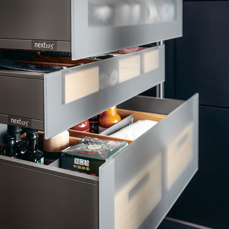 Ähnlich wie der Space Tower von Blum befinden sich diese Schubladen hinter einer Türfront oder hinter der Front einer tiefen Schublade. Hier ausgeführt in Milchglas mit einer Ladeneinrichtung aus Holz: die next125 Flex Boxen aus echter Eiche.