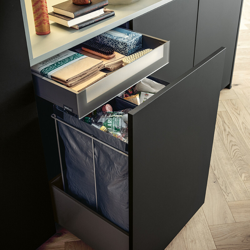 Unter der Spüle gibt es immer einen speziellen Spülunterschrank. Schließlich braucht man Platz für den Abfluss, den Anschluss für den Geschirrspüler und heutzutage oft auch für das Quooker-Reservoir. Der verbleibende Platz wird in der Regel für ein Abfallsystem, wie hier von Blanco, und als Stauraum für Reinigungsmittel genutzt.