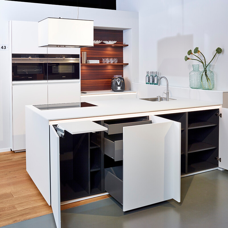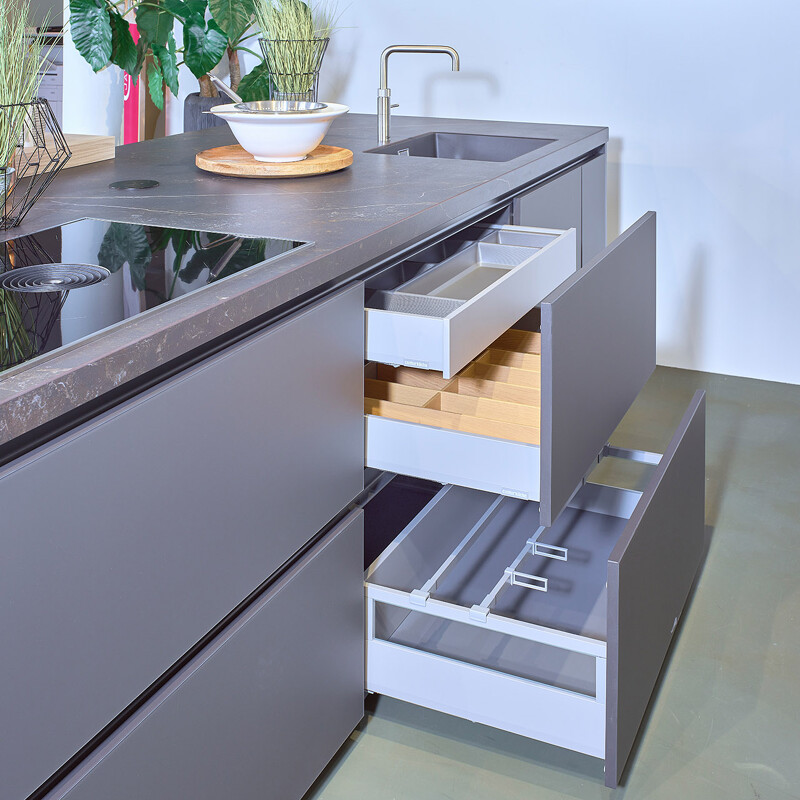 Unterschränke mit Schubladen sind beliebt, weil sie äußerst praktisch sind. Der Inhalt ist auf einen Blick zu erkennen und sofort griffbereit. Schubladenschränke für die Küche werden gerne breit geplant, damit zum Beispiel größere Pfannen oder das gesamte Geschirr und Besteck Platz finden. Ein Unterschrank mit Schubladen eignet sich auch hervorragend als Vorratsschrank. Schubladen in einer grifflosen Küche können mit einem motorisierten oder nicht motorisierten Tip-on-System oder durch eine Griffleiste geöffnet werden. In unseren Ausstellungsräumen können Sie alle Möglichkeiten sehen und ausprobieren.