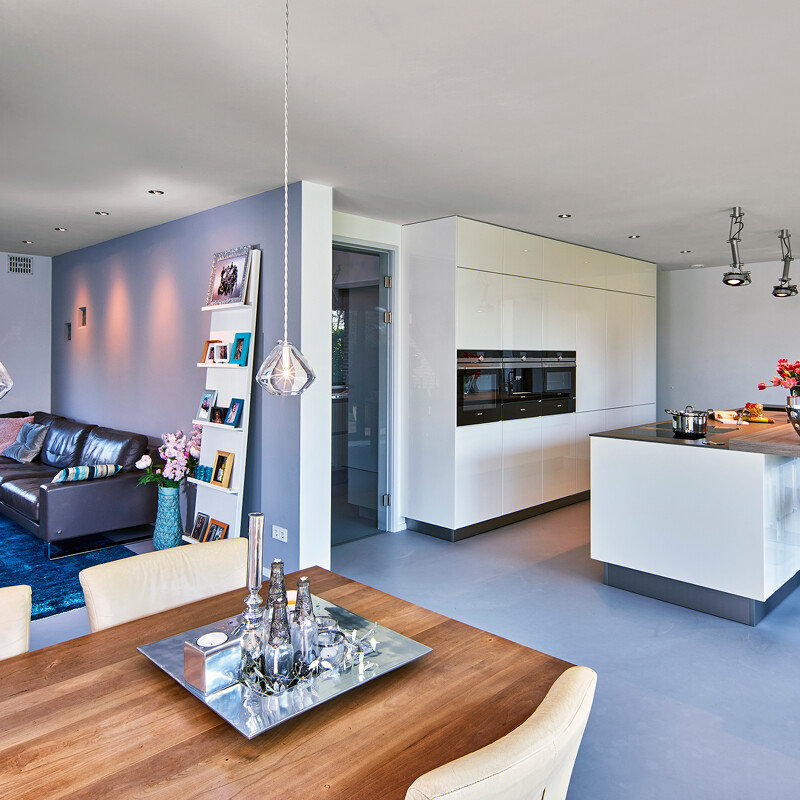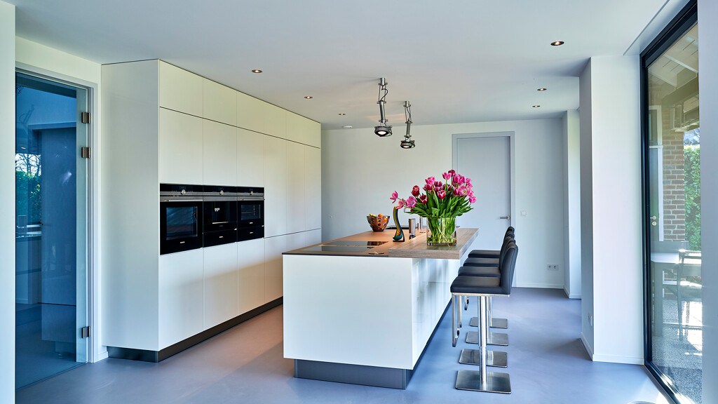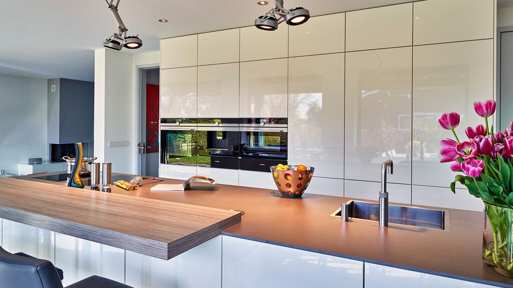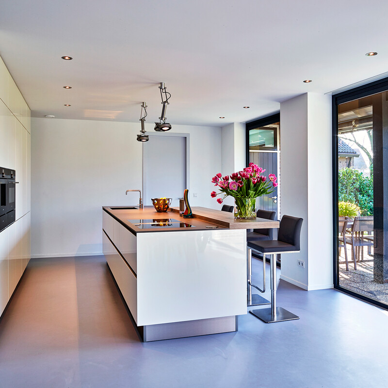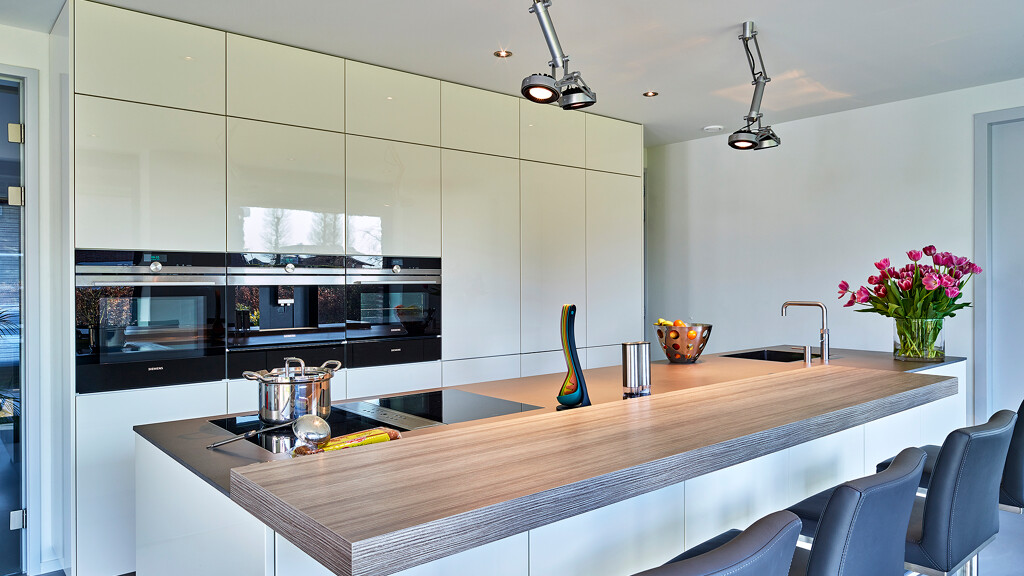 Hier präsentieren wir eine wunderschöne, moderne Inselküche von Contur und next125 in Hochglanz kristallweiß mit grifflosen Fronten und einer Theke aus Holz, welche 4 Barhockern Platz bietet. Dadurch, dass der Wandschrank bis an die Decke durchläuft und die 3 Einbaugeräte nicht in der Mitte sondern an der linken Seite, gegenüber der Barhocker, platziert wurden, entsteht eine Komposition welche sich von durchschnittlichen Inselküchen unterscheidet. Die Insel ist ausgestattet mit einer Induktionsplatte von O+F mit Absaugfunktion und Plasmafilter und einer Spüle mit Quooker Fusion Kran. Im Wandschrank befinden sich u. a. ein Ofen, ein Dampfgarer und ein Kaffeevollautomat von Siemens.