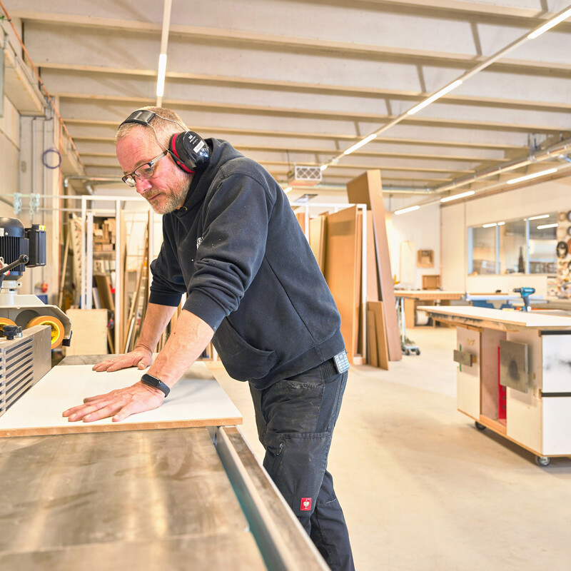 In der Tischlerwerkstatt werden unsere Manufaktur Küchen angefertigt: UNIKAT by Ekelhoff. Auch werden hier Barplatten hergestellt und außergewöhnliche Designs und Details realisiert, wodurch standard Markenküchen individuell "getuned" werden. Auf der Abbildung hierunter sehen Sie wie durchlaufende Furniere für eine komplette Schrankwand ausgesucht werden. Ekelhoff verwendet extra dickes, hochwertiges Furnier und Hirnholzfurnier, durch das beispielsweise auch ganz grobe Balkeneiche wie Massivholz aussieht.