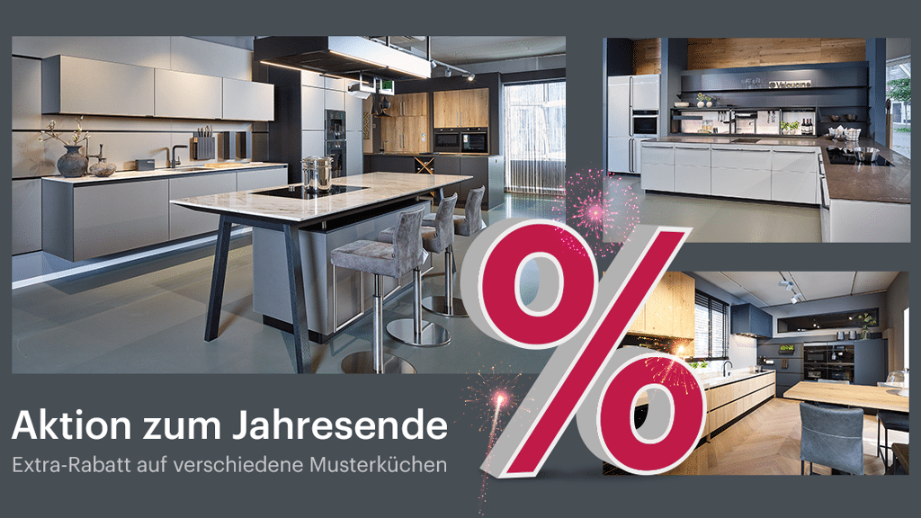 Profitieren Sie bis zum 31.01.2022 von einem zusätzlichen Jahresend-Rabatt auf viele unserer bereits reduzierten Ausstellungsküchen. Diese Küchen sind echte Hingucker, ausgestattet mit hochwertigen Geräten, besonderen Arbeitsplatten und auffälligem Design. Von ländlich über industriell bis skandinavisch.