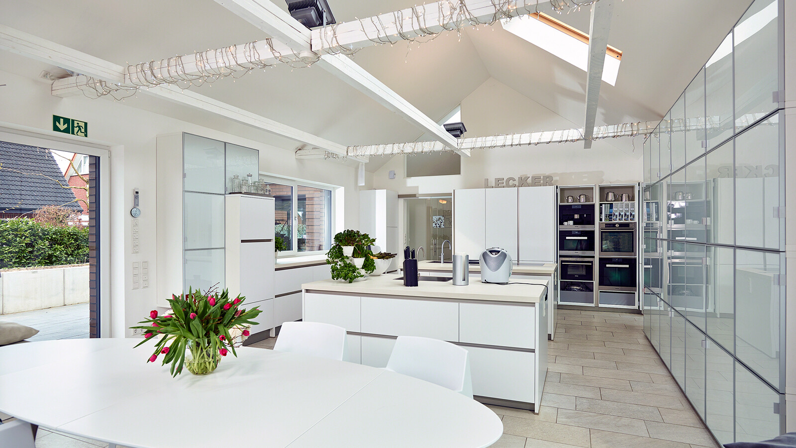 Eine Kücheninsel ist nicht nur gesellig und praktisch für die Küche zu Hause, sondern auch äußerst geeignet in einer Kochschule. Diese mattweiße Contur Nova Küche verfügt über 2 Inseln, einer Anrichte und viel Stauraum. Köchin Kristina Wedi bietet Kurse für das Kochen mit dem Dampfgarer und mit dem Thermomix, worüber sie auch ein dickes Kochbuch schrieb. Die Küche hat grifflose, mattweiße Fronten und Arbeitsplatten von 45 mm dicker Keramik. Auffallend sind die flachen Wandschränke mit Milchglas-Fronten, in denen alle Flaschen und Vorratsdosen ordentlich und griffbereit nebeneinander stehen.