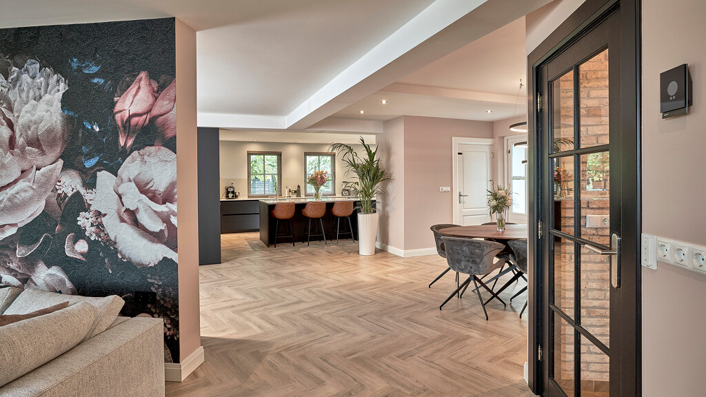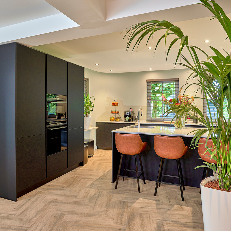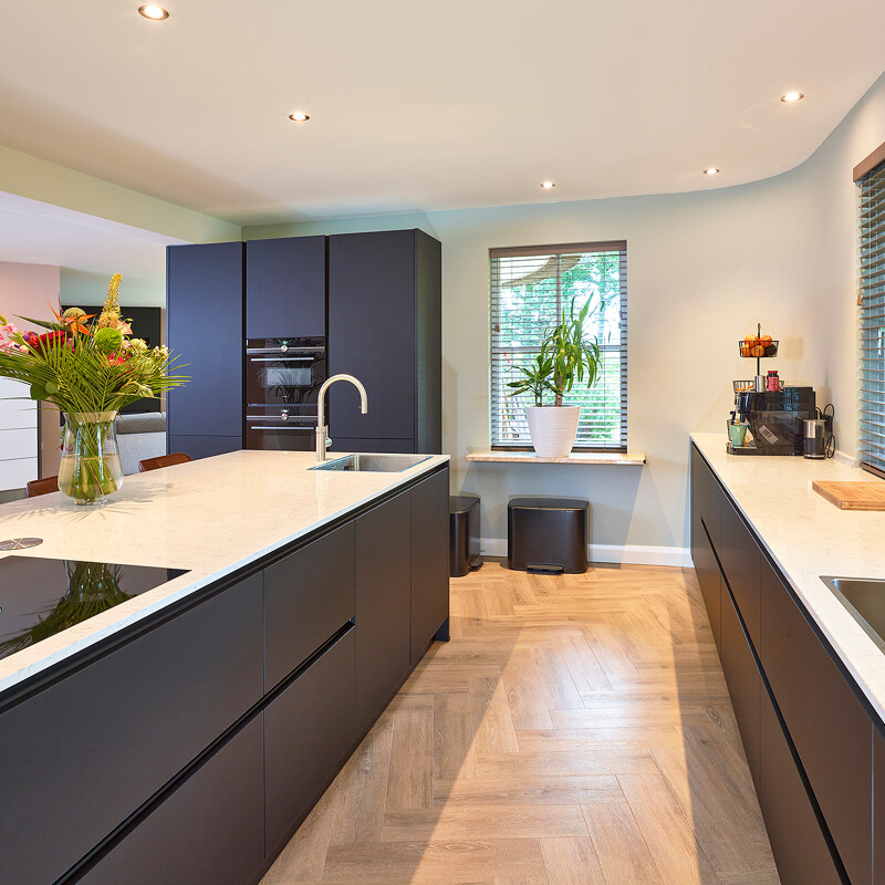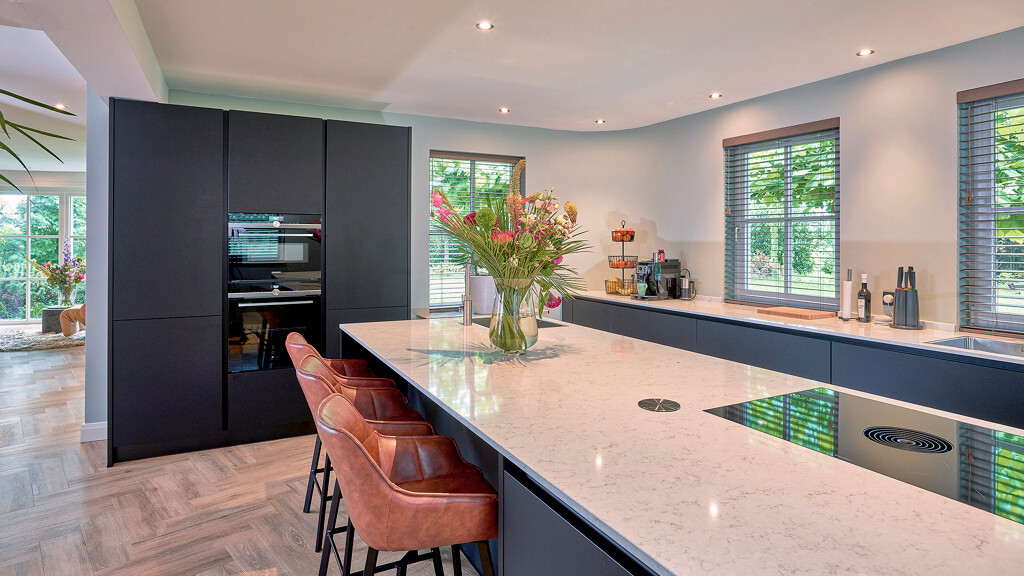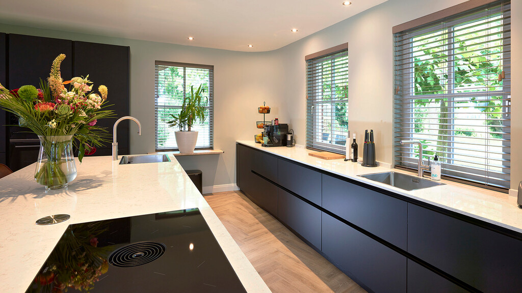 Diese außergewöhnlich stimmungsvolle Küche durften wir bei einer Familie in Haaksbergen (NL) fotografieren. Die Küche stammt von unserer Hausmarke Contur und verfügt über matte, onyxschwarze UV-Lack-Fronten und eine Komposit-Arbeitsplatte in der Farbe Blanco Orion. Die Wand hinter der Küchenzeile hat abgerundete Ecken; deshalb wurden auch die Ecken an der Arbeitsplatte entsprechend angepasst. Die Küche ist mit zwei Spülen ausgestattet, eine davon mit einem Quooker, einem Bora-Kochfeld mit Abzug, einem Backofen, einer Mikrowelle, einem Kühlschrank und einer Spülmaschine von Siemens. Die sanften Pastellfarben an den Wänden bilden einen schönen Kontrast zur schwarzen Küche, und die vielen Sprossenfenster, die ins Grüne blicken lassen, schaffen eine gemütliche und einladende Atmosphäre. Unser Berater Hartmut Vennegerts hat diese Küche geplant.