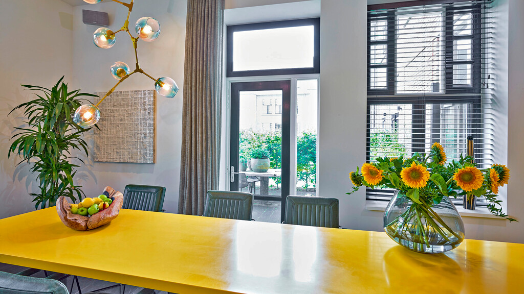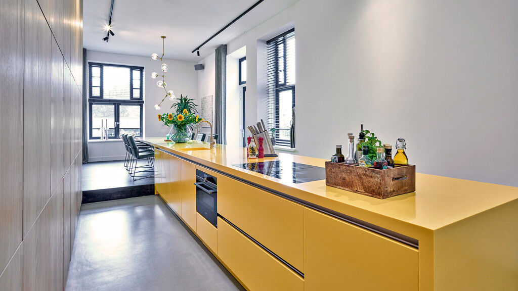 Es ist ein mutiger und wunderschöner Entwurf für diesen langen, schmalen Raum. Die Arbeitsplatte verläuft weiter über einen erhöhten Fußboden und bildet so einen Esstisch. Die deckenhohe, hölzerne Schrankwand mit klaren Linien und durchlaufendem Furnier ist ein schönes und natürliches Gegenstück. Sie stammt übrigens nicht aus unserer eigenen Manufaktur, wir hätten sie jedoch auch fertigen können. Die Insel verfügt über eine Spüle in demselben gelben Corian, eine Kochplatte mit Abzug von O+F, einen Kombi-Ofen und eine Spülmaschine von Siemens.