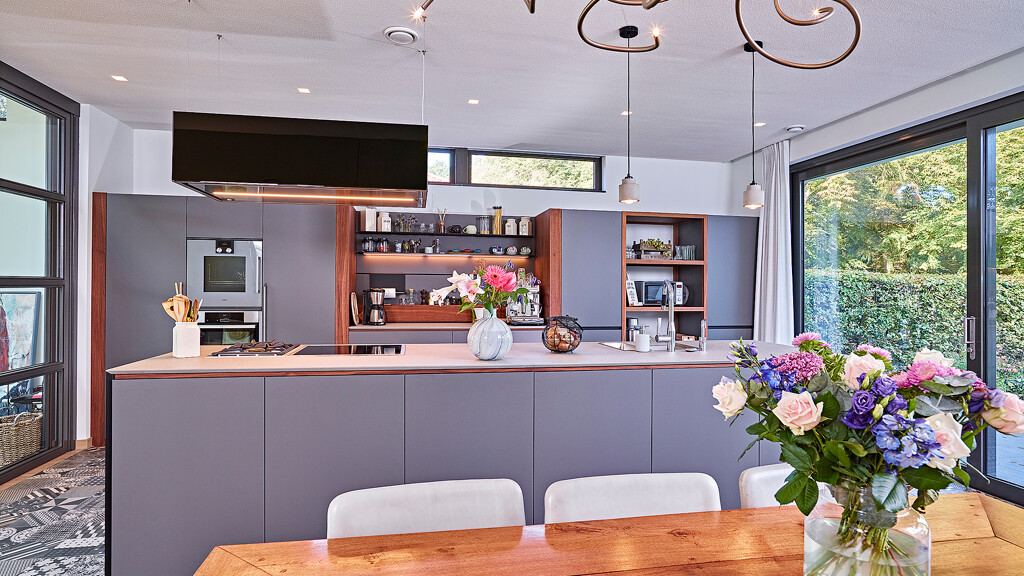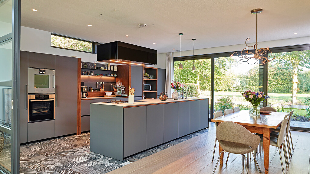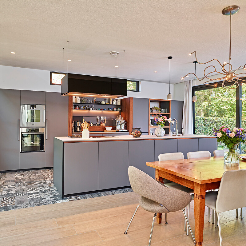 Diese besondere Küche der italienischen Designmarke Valcucine stammt aus der Linie Forma Mentis. Die Fronten sind im samtweichen Mattlack ‚Angel Skin‘ in der Farbe Aschgrau lackiert und viele Elemente der Küche bestehen aus Nussbaum. Die strukturierte Arbeitsplatte ist aus Naturstein: Quarzit Imperialgrau. Sie ist 6 cm stark mit abgeschrägten Kanten. Dadurch bekommt die Steinplatte eine filigrane Ausstrahlung und das Nussholz hinter der Griffleiste wird somit sichtbar. Die Insel ist mit einer Gaggenau Vario-Kombination ausgestattet, welche aus einem Gas-Wokbrenner und Induktionskochzonen besteht. Über der Insel hängt eine große Abzugshaube mit schwarzen Glaspanelen und einem Plasmafilter. Unsere Kunden erzählten uns, dass sie erst die Bodenfliesen ausgesucht hatten und dann bei uns auf diese Küche stießen…