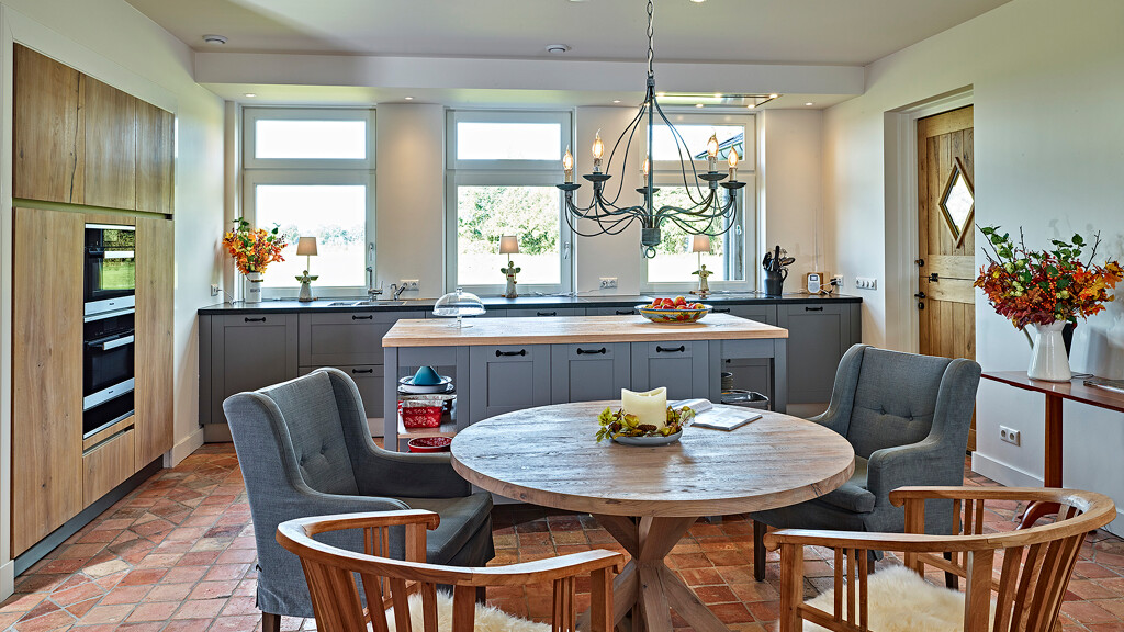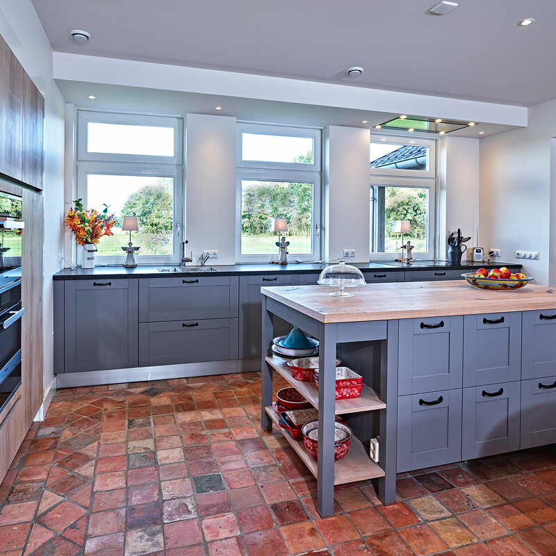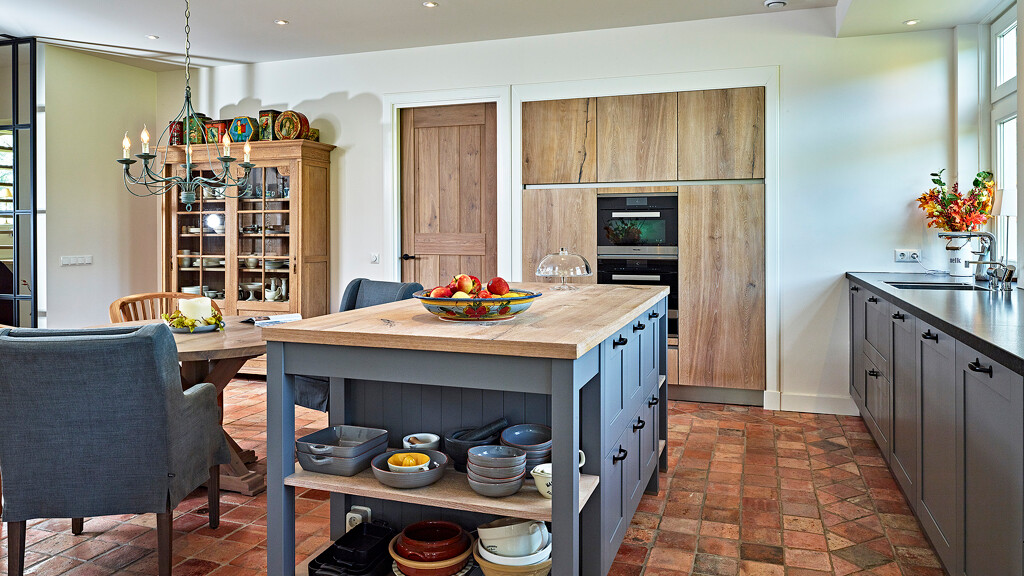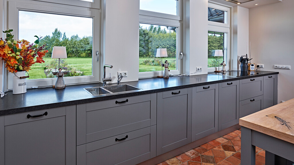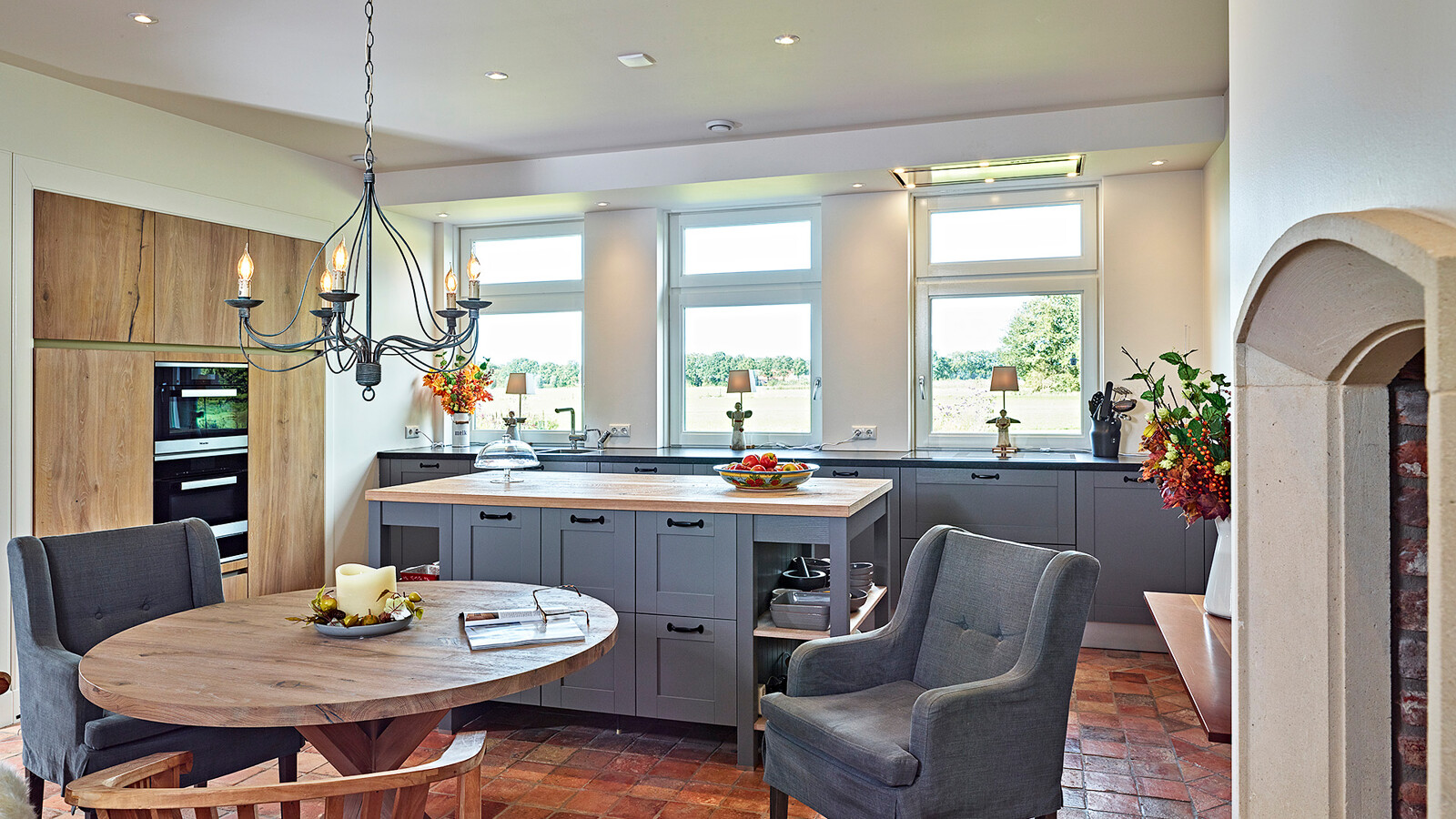 Diese moderne Landhausküche befindet sich auf einem romantischen Bauernhof inmitten weitläufiger Ländereien im Osten der Niederlande. Die Küche ist eine Kombination achatgrauer Panelfronten von Contur Casa und grifflosen Balkeneichenfronten (die hohe Schrankwand) aus unserer eigenen Manufaktur-Werkstatt. Die Insel wurde komplett nach den Wünschen unseres Kunden durch unseren Verkäufer Ralf Averbeck umgesetzt und in unserer Werkstatt gebaut. Die Arbeitsplatte der Insel besteht aus derselben Balkeneiche wie der Einbauschrank, die Anrichte ist aus schwarzem Granit. Alle Einbaugeräte in dieser Küche kommen von Miele.