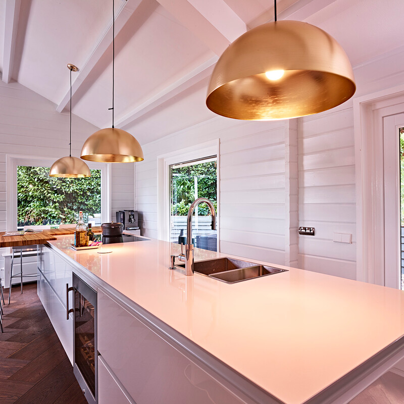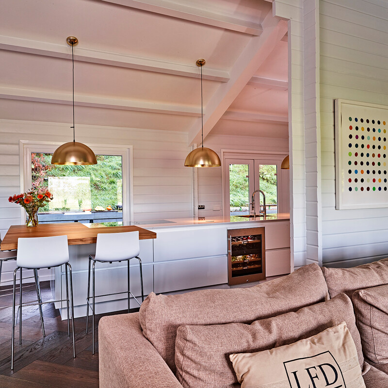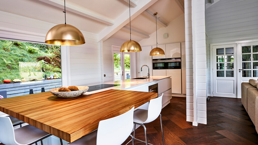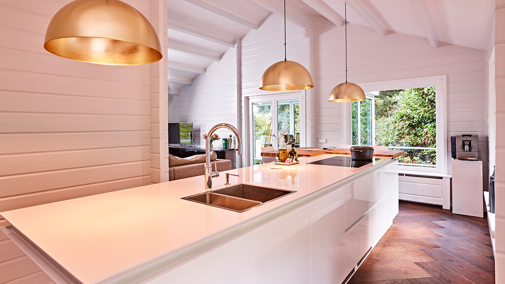Diese großzügige Inselküche von next125 NX501 hat Fronten in kristallweißem UV-Hochglanzlack und einer glänzend weißen Komposit-Arbeitsplatte. Die große Barplatte besteht aus hellem Nussbaum-Echtholzfurnier und bietet für 4 Barhocker Platz. Sie wurde in unserer Küchen-Manufaktur maßgefertigt. In der hohen Schrankwand befindet sich ein Kühlschrank, ein Kombi-Dampfgarer und eine Kombi-Mikrowelle von Siemens. Die Insel ist mit einer Miele-Spülmaschine, einem Weinklimaschrank, einer Induktionsplatte mit integriertem Abzug und einer Doppelspüle mit einem Quooker-Flex-Kran ausgestattet. Die Holzbalken der Decke und die Wandborde wurden in diesem geschmackvoll umgebauten Haus mit skandinavischem Flair in der Nähe von Nijmegen (NL) weiß lackiert. Das Haus wurde, untypisch für die Niederlande, gegen einen Berghang gebaut.