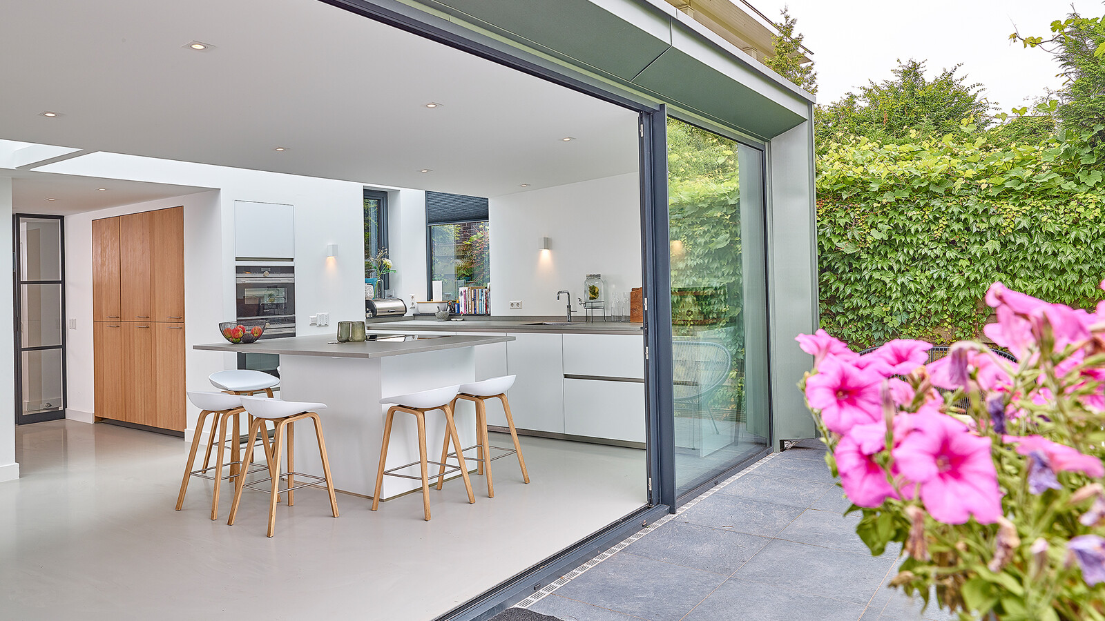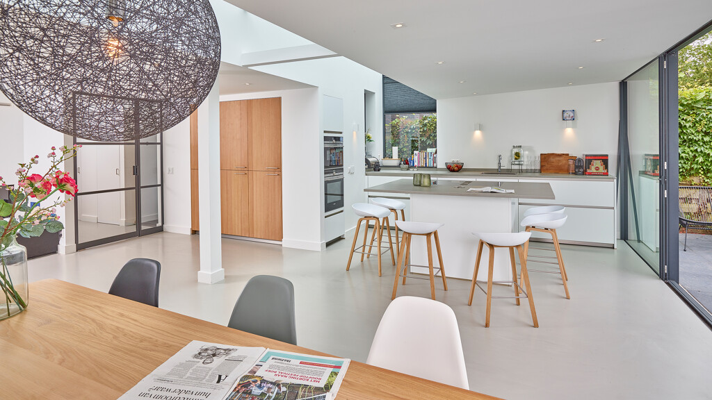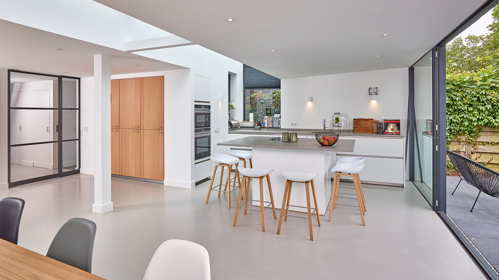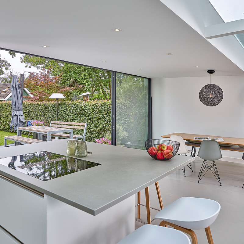 Eine riesige Glasfront Richtung Garten und eine gläserne Decke sorgen für ganz viel Licht und Räumlichkeit in diesem besonderen Haus in Amstelveen (NL). Wir durften hier diese moderne Küche von next125 mit grifflosen Fronten im samtmatten Lack montieren. Besonders ist die an 3 Seiten überstehende Keramik Arbeitsplatte auf der Kochinsel. Dadurch entsteht Platz für 6 Barhocker. Ein Ofen und ein Kombi-Dampfgarer wurden, genau wie der hohe Wandschrank, in die Wand integriert. Die Fronten dieser Schrankwand stammen aus unserer Manufaktur-Werkstatt und bestehen aus extra dickem Eiche-Select Echtholzfurnier ohne Äste, dafür gebürstet und geölt. In der Schrankwand befinden sich ein Kühlschrank, ein Gefrierschrank und ein Vorratsschrank. Alle Geräte in dieser Küche kommen von Siemens, außer der Quooker Combi + E.
