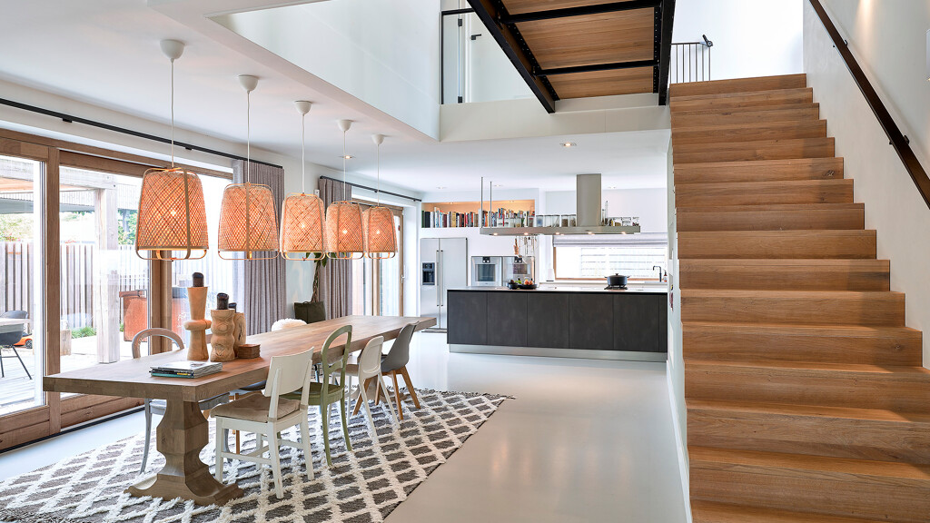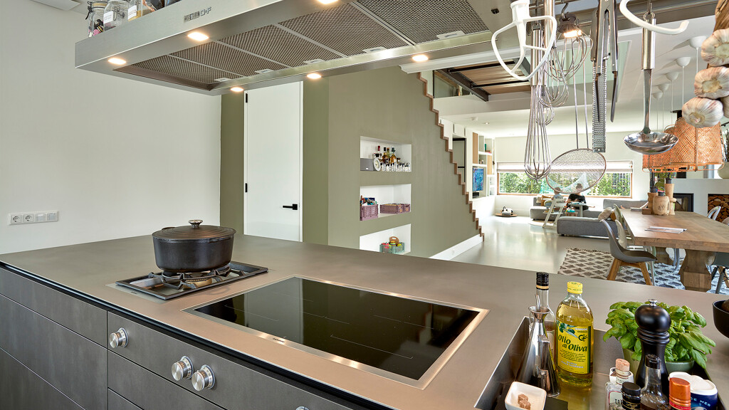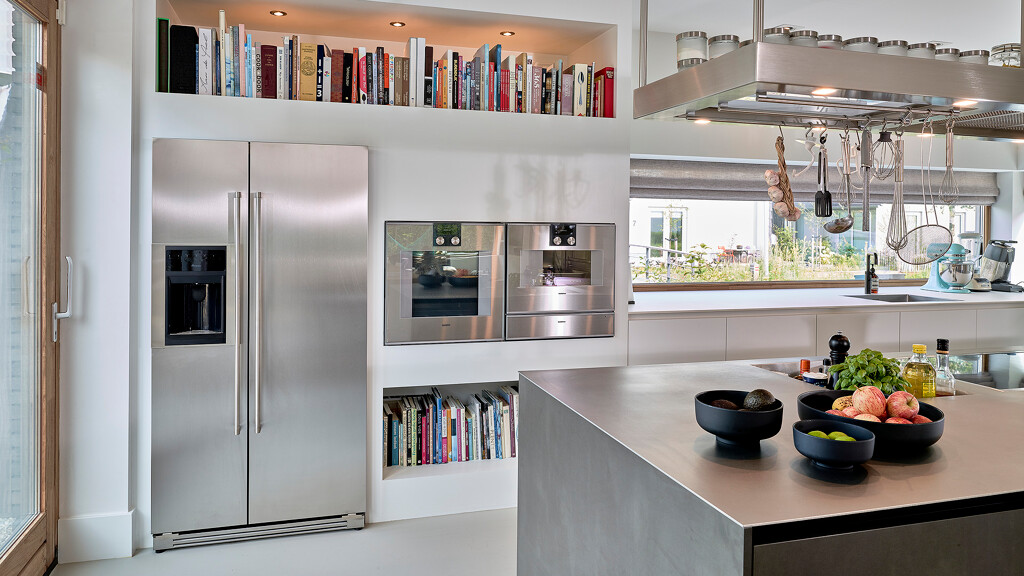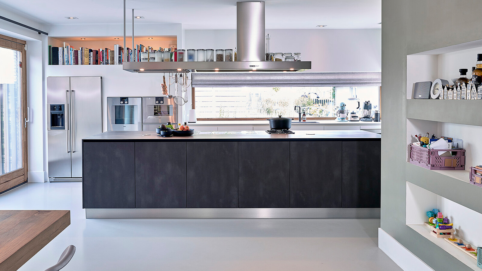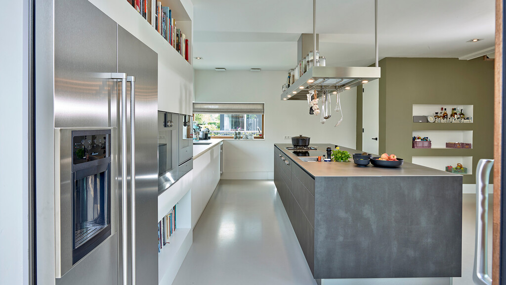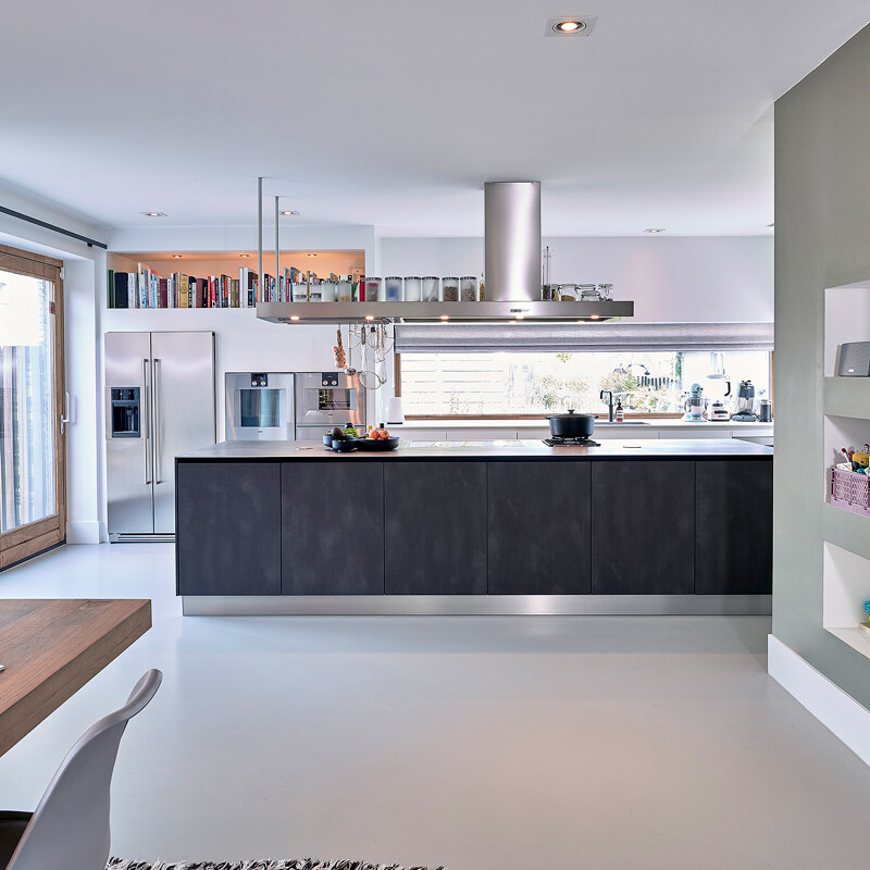 Diese rustikale Küche mit industriellem Flair von Contur mit Fronten in dunklem Stahl und kristallweiß durften wir in Diemen (NL) montieren. Es handelt sich um die Privatküche eines Profikochs, der eine etwas andere Auswahl trifft. Auf dem markanten Regal über der Insel sind die Kochutensilien schnell zur Hand, und auf der warmgewalzten Edelstahl-Arbeitsplatte befindet sich neben den Gaggenau Vario-Kochfeldern mit Wok-Brenner und Flex-Induktionskochfeld ein Becken mit Ablauf für häufig verwendete Flaschen und Gewürze. Dieser Behälter kann auch mit Eiswürfeln gefüllt werden, um Sushi oder Austern zu kühlen, erklärt Jeanin Oude Wolbers, unsere Küchenberaterin, die diese Küche entworfen hat. Die Arbeitsplatte unter dem Fenster besteht aus Keramik in der Farbe Arctic White und verfügt über einen schwarzen Quooker Fusion, der sowohl kochendes als auch gekühltes und sprudelndes Wasser liefert. In dieser Küche gibt es einen Backofen, einen Dampfgarer und eine Wärmeschublade von Gaggenau, einen Side-by-Side-Kühlschrank und eine Dunstabzugshaube von O+F sowie einen Geschirrspüler von Miele.