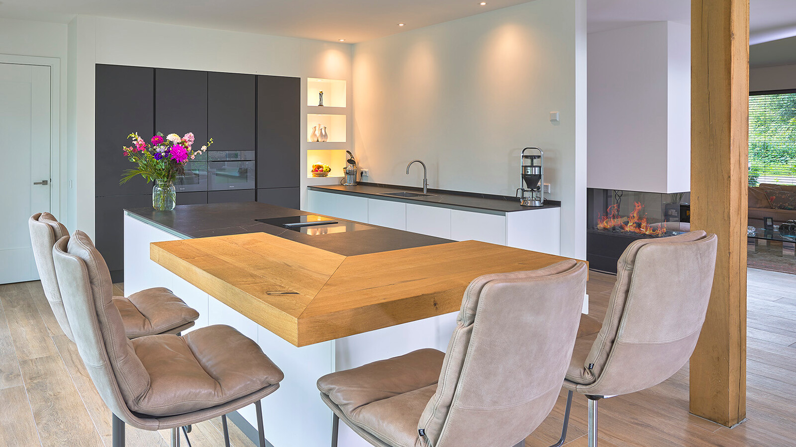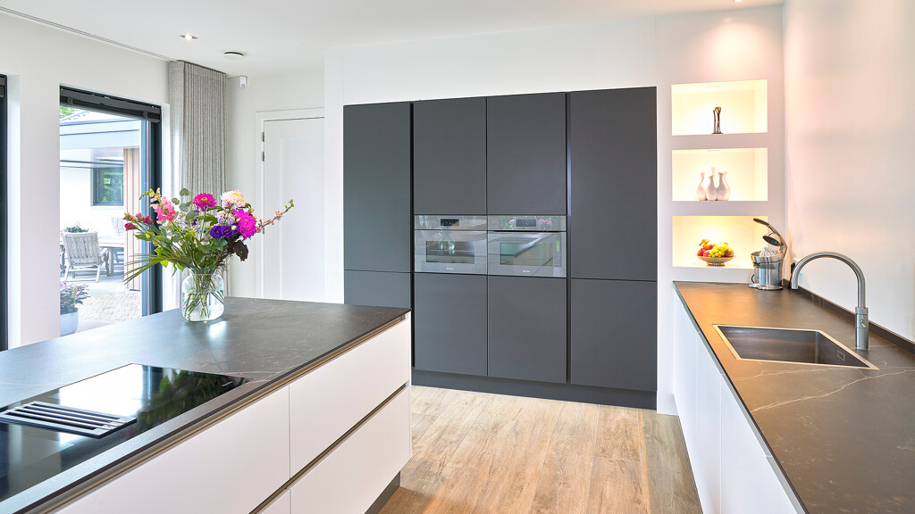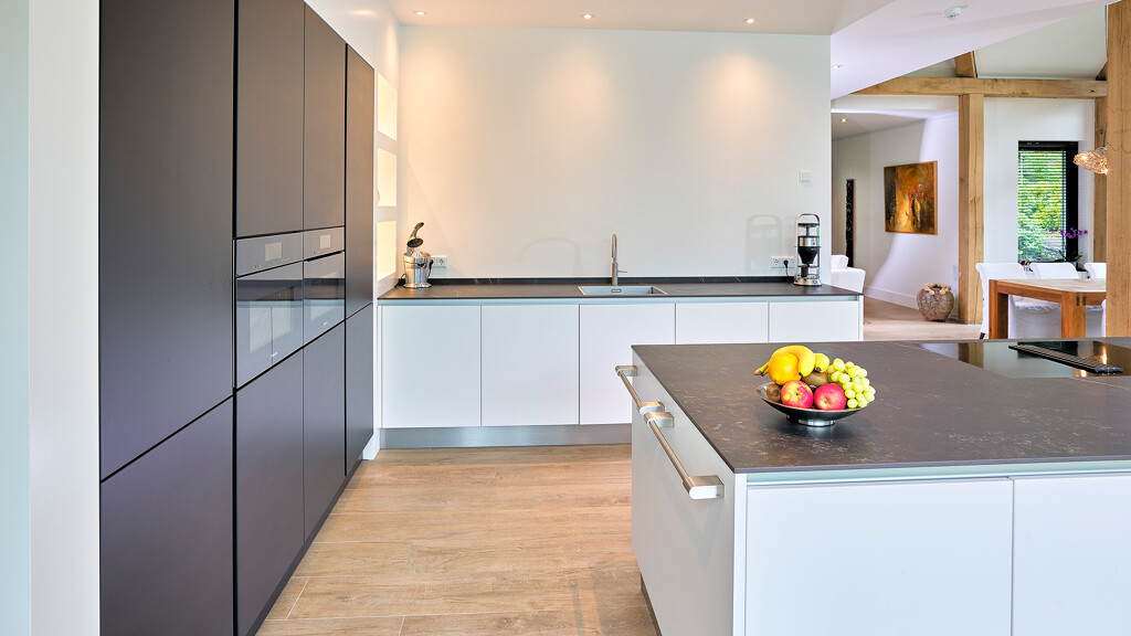 Wir haben diese schöne und praktische Contur Biella Eckküche bei einer Familie in Lochem eingebaut. Mit grifflosen Fronten in weißem und lavaschwarzem Satinlack und einer 12 mm starken Dekton-Keramikarbeitsplatte in der Farbe Kelya. Der hohe Wandschrank ist mit einem Umbau versehen, in dem drei Nischen mit Beleuchtung über der Arbeitsplatte geschaffen wurden. Alle Geräte in dieser Küche sind von Miele, darunter ein Backofen mit Mikrowellenfunktion und ein Combi-Dampfbackofen in graphitgrau. Auf der Arbeitsplatte ist eine L-förmige Barplatte aus Balkeneiche befestigt, die Platz für vier Barhocker bietet. Diese Barhocker sind von der Marke KFF Design und stammen ebenfalls von Ekelhoff.