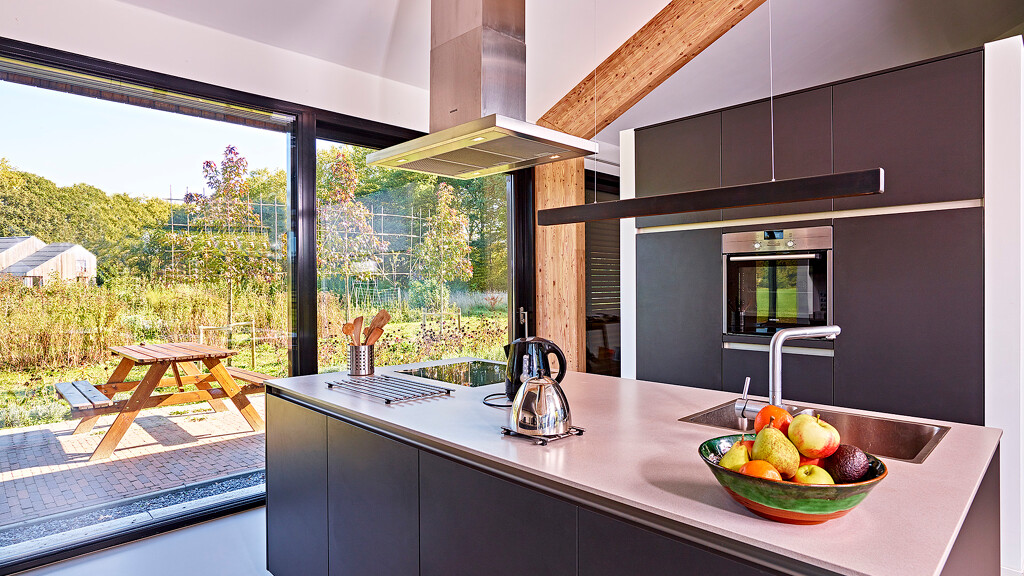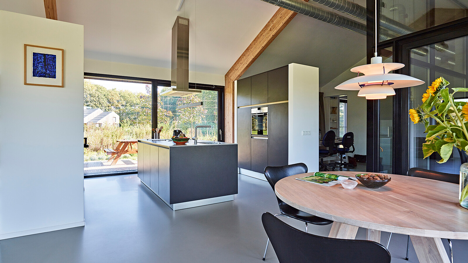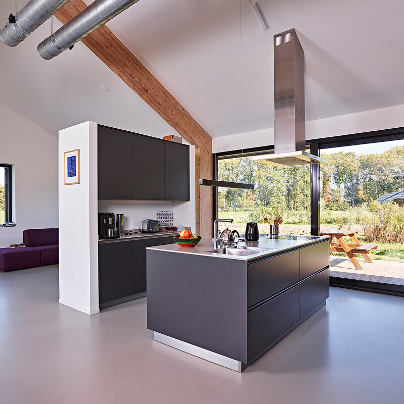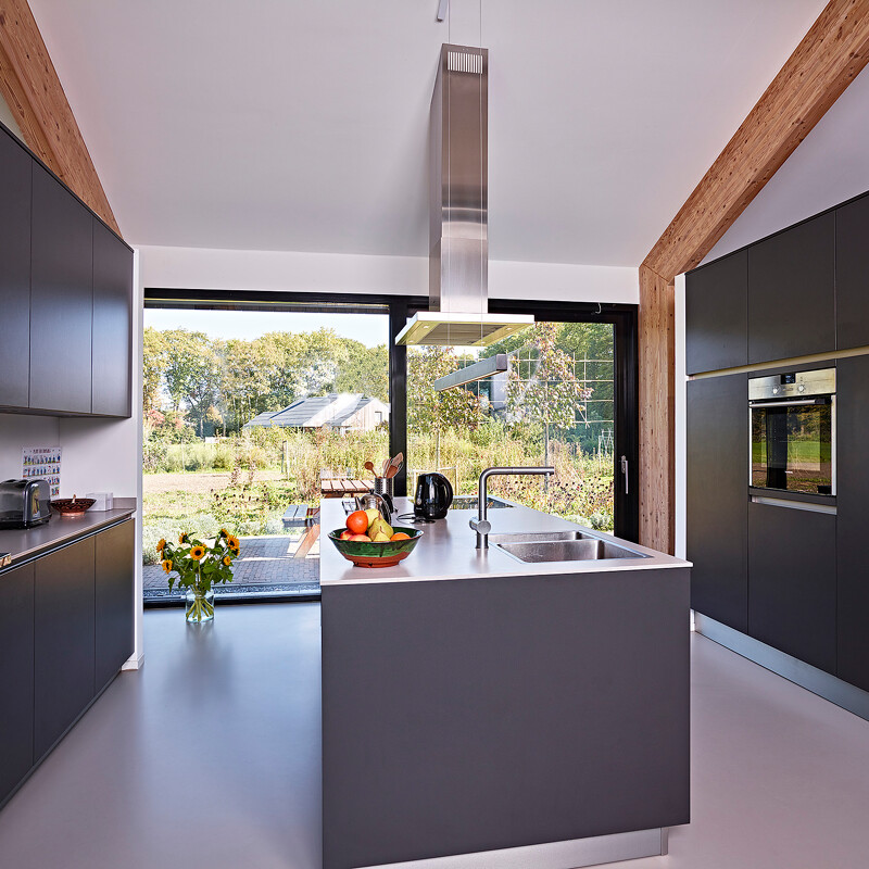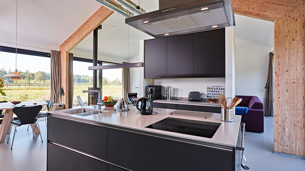 Mitten im Grünen, in der Nähe von Zutphen (NL), liegt dieses besondere, energieneutrale Haus. Rundum sind große Fenster vorhanden, sodass das Gefühl des Draußenlebens das ganze Jahr hindurch gelebt werden kann. Die Kücheninsel und die 2 hohen Schrankelemente stehen frei im Raum, wodurch der geräumige Effekt zusätzlich verstärkt wird. Hier entschied man sich für eine Küche von Contur mit mattschwarzen Kunststoff-Fronten und einer hellgrauen Silestone Komposit Arbeitsplatte. An der einen Seite der Insel befindet sich eine hohe Schrankwand mit Ofen, Kühlschrank und Vorratsschrank, an der anderen Seite eine extra Anrichte und Oberschränke. Geplant wurde die Küche von unserem Berater Carsten Palstring.