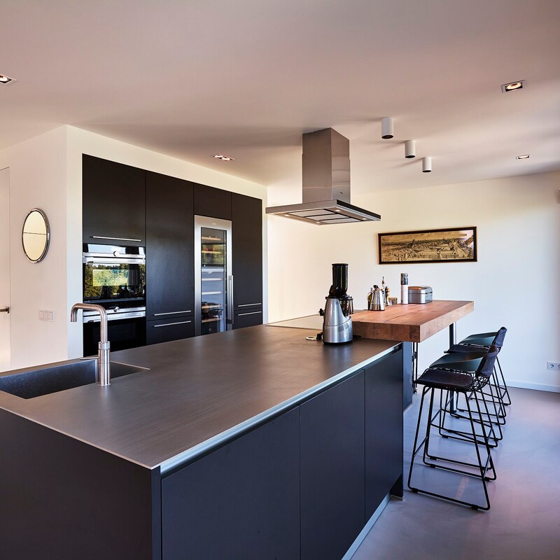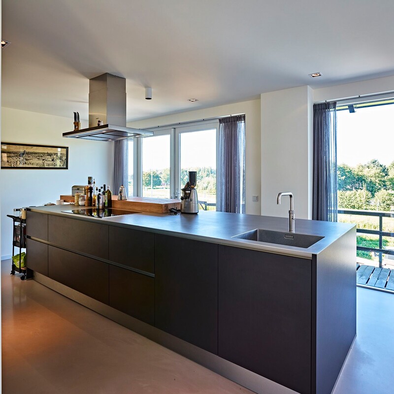 Diese luxuriöse, mattschwarze Contur Nova Inselküche montierten wir bei einer Familie in der Nähe von Rotterdam. Die grifflosen Fronten sind aus lavaschwarzem Kunststoff und die Arbeitsplatte besteht aus warmgewalztem Edelstahl mit eingeschweißter Spüle. Die Vario-Induktionsplatte von Siemens ist mit einem TeppanYaki und einer Grillplatte ausgestattet.