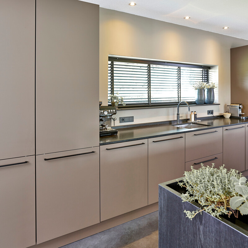 In der Nähe von Groningen durften wir diese schöne SieMatic-Küche aus der Urban-Serie montieren. Die Fronten bestehen aus dem äußerst robusten Similaque in einer matten Umbra-Samtausführung. Die offenen Laden sowie der Umbau mit einer Mulde für Flaschen und Kräuter sind aus Eiche Onyx. Die Urban-Stilwelt basiert auf dem Leben in Großstädten und sorgt für eine entspannte Loftatmosphäre. Auffällige Merkmale sind die offenen Elemente, der erhöhte Kräutergarten und die Arbeitsplatte bzw. das Thekenelement in verschiedenen Stärken, was unterschiedliche Arbeitshöhen schafft. Das bietet nicht nur eine verspielte Optik sondern auch einen ergonomischen Vorteil, wenn zwei unterschiedlich große Personen die Küche nutzen. Die roten Barhocker aus Metall passen perfekt zu diesem Stil.