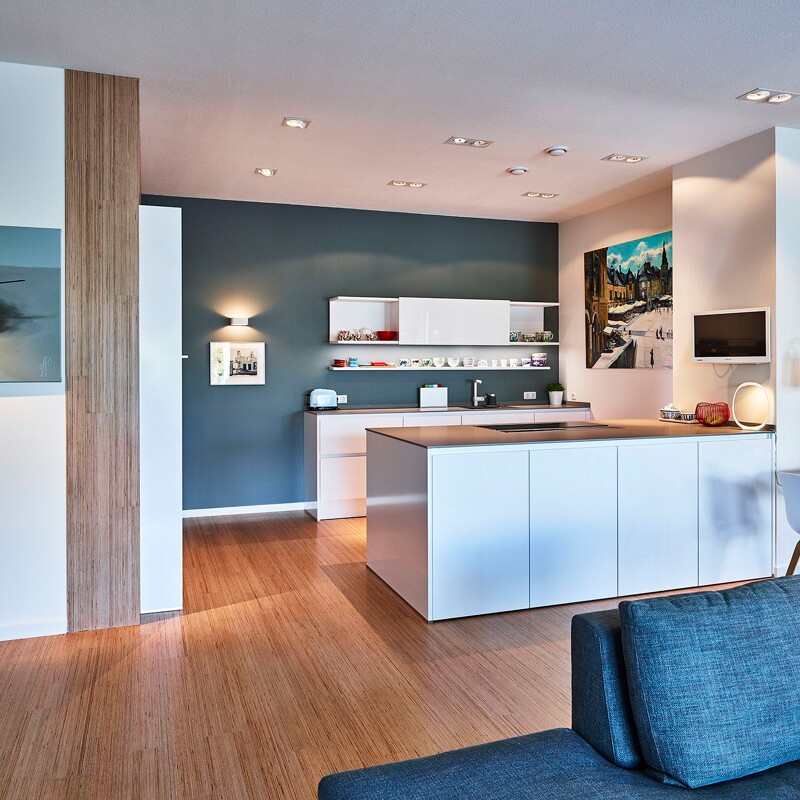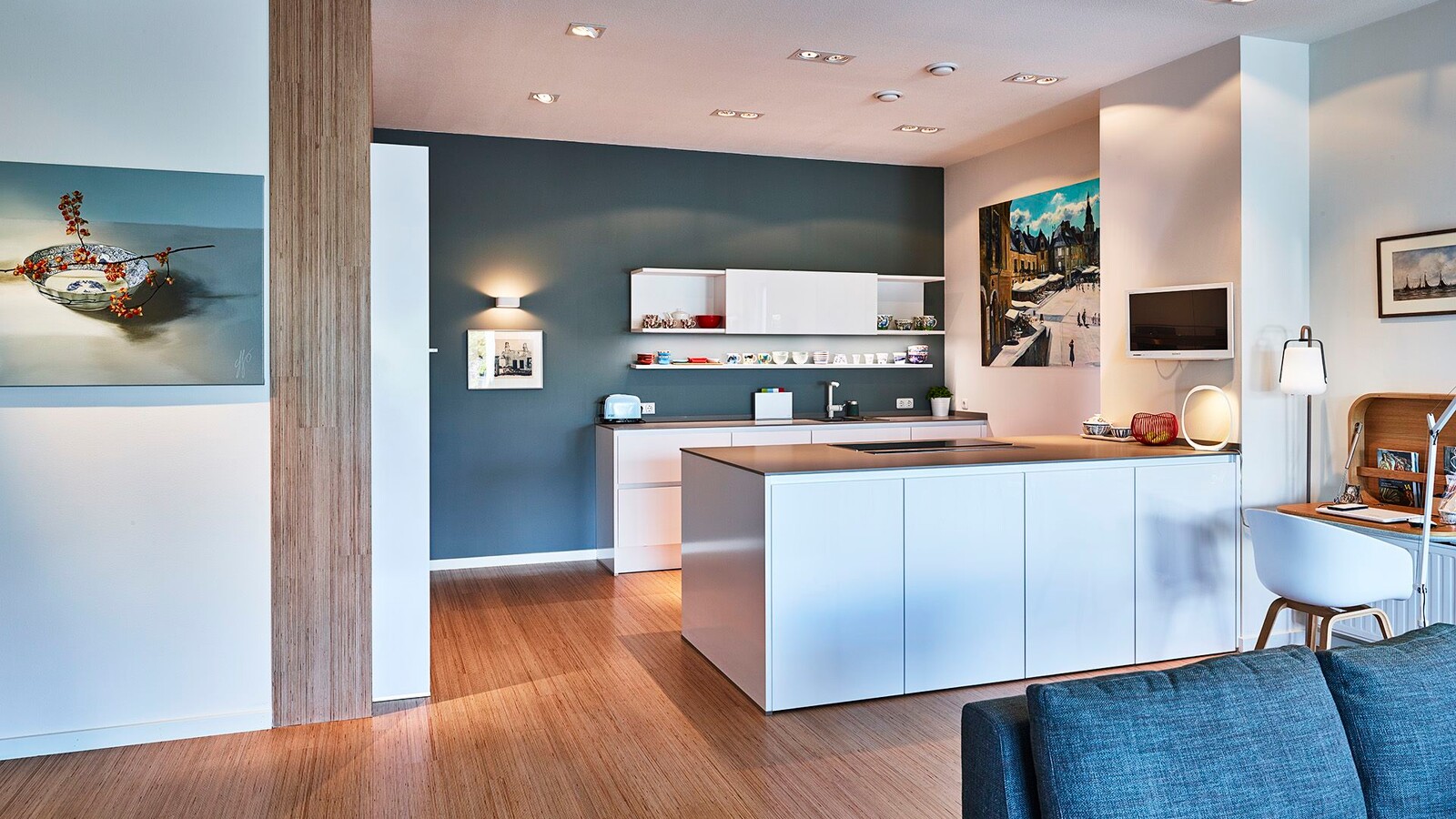 Diese offene Küche mit Halbinsel ist eine Kombination matter Fronten von next125 und Hochglanzfronten von Contur, beide in kristallweiß. Die Arbeitsplatte ist aus Komposit Quarz Form in portlandgrau. Um die hohe Schrankwand herum befindet sich ein hölzerner Umbau, auch Passepartout genannt, im selben Material wie der Fußboden. Die blaugraue Farbe der Rückwand spiegelt sich in den Bildern wider. Das gibt einen besonders schönen Effekt. Die weißen Einbaugeräte kommen von Siemens: eine Kombi-Mikrowelle, ein Ofen und eine Kaffeemaschine. In die Insel ist eine 90 cm breite Induktionsplatte integriert auf der die Töpfe nebeneinander stehen. Dahinter befindet sich ein Siemens Downdraft-Air-Abzugsystem, welches erst aus der Arbeitsplatte herausgefahren wird wenn man es benötigt und nach dem Kochen wieder dorthin verschwindet.
