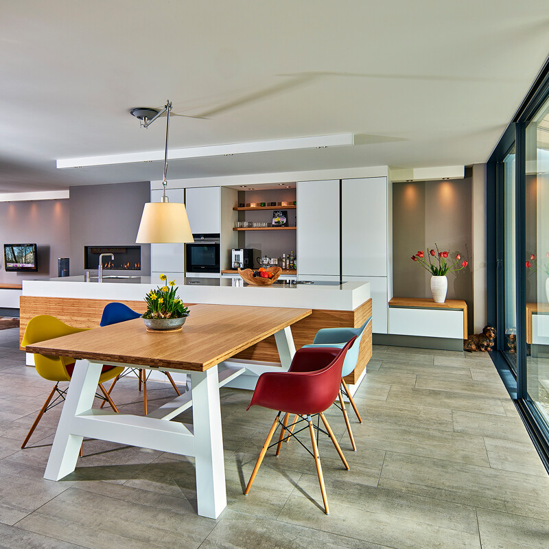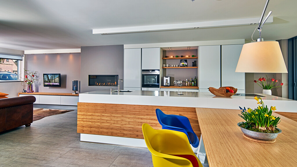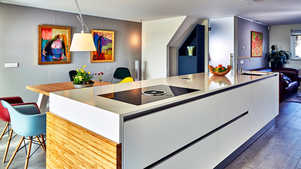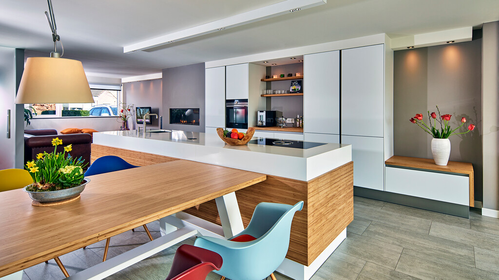 Diese geräumige und stilvolle Wohnküche von next125 aus der Serie NX500 hat kristallweiße Satinlack-Fronten und eine weiße, 2 cm starke Komposit-Arbeitsplatte. Die Koch- und Spülinsel ist mit honigfarbenen Bambuspanelen aus unserer eigenen Küchen-Manufaktur verkleidet. Auch die Platte vom Esstisch und die Borde in der Nische und auf dem niedrigen Schrank im Wohnbereich sind aus Bambus und wurden für unseren Kunden maßgefertigt. Die Arbeitsplatte ist mit einer Bora-Kochplatte mit Absaugsystem und einer Spüleinheit mit einem Combi-Quooker ausgestattet.