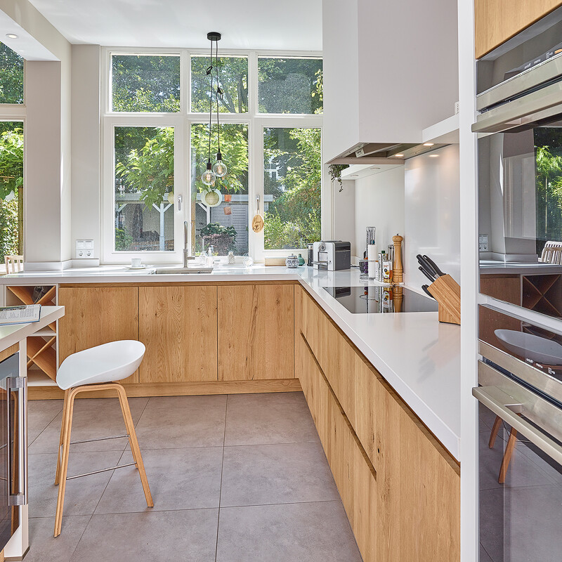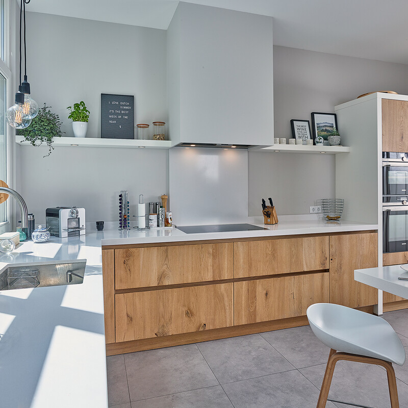 In einem klassischen Stadthaus in Den Haag durften wir diese moderne und gemütliche Familienküche mit skandinavischem Flair montieren. Es ist eine Küche in L-Form mit geölten Fronten aus Balkeneiche aus unserer eigenen Manufaktur und einer 5 cm dicken Komposit-Arbeitsplatte in der Farbe White Storm. Die 6 cm dicken Seitenwangen sowohl vom Hochschrank als auch von der Anrichte und der Insel sorgen für einen rüstigen und zugleich frischen Effekt. Die kleine Insel bietet Platz für 2 Barhocker und extra Stauraum. Alle Geräte, darunter ein Dampfgarer, kommen von Siemens. Der Kran ist ein Quooker Combi+. Diese Küche wurde von unserem Mitarbeiter Thomas Szellas geplant.