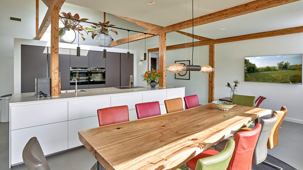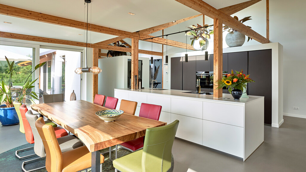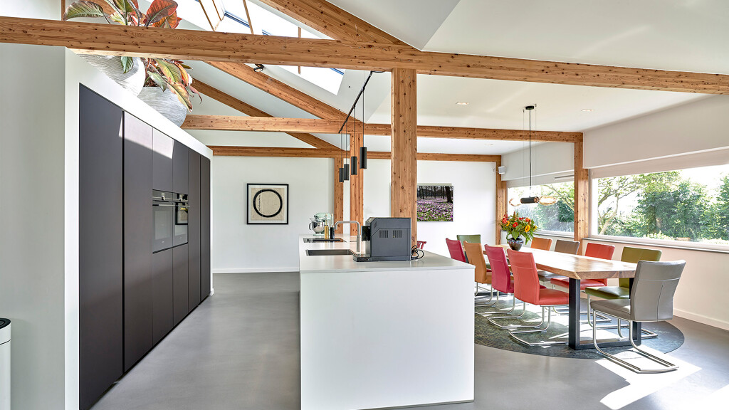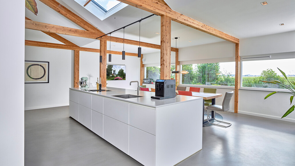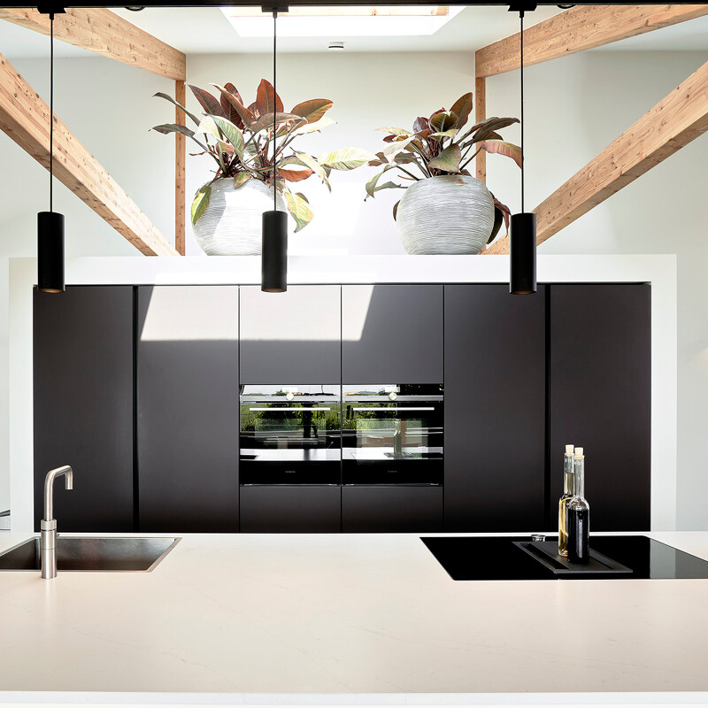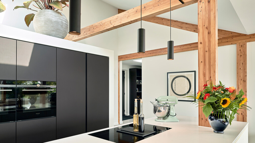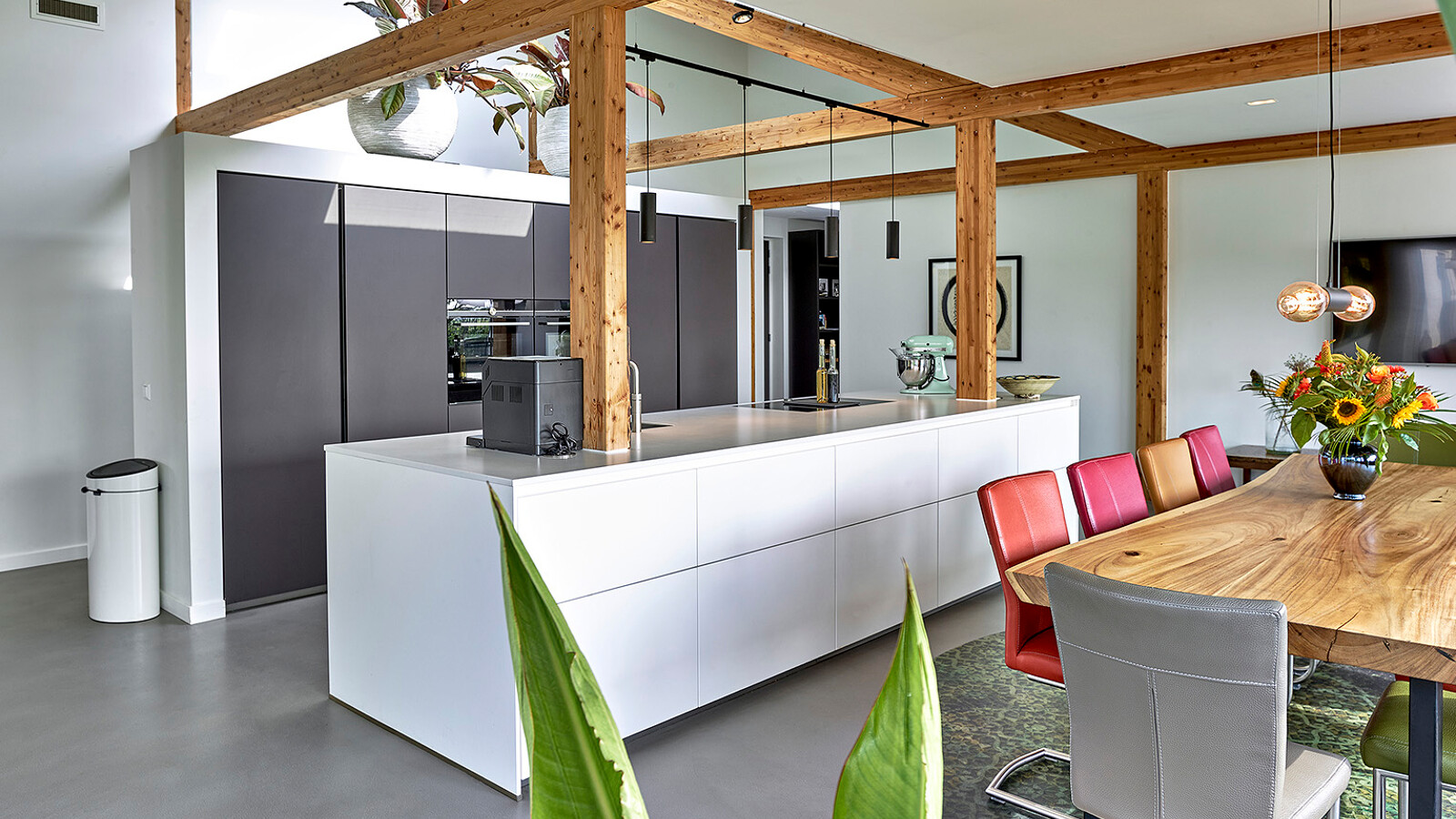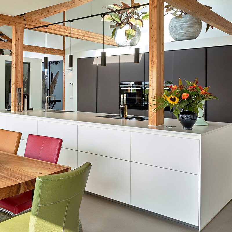 In diesem schönen, modernen Haus mit viel Licht und einer markanten Balkenkonstruktion durften wir diese Küche der Marke next125 montieren. Die grifflosen Fronten der Insel sind in Lack weiß satiniert, die Hochschränke in dem supermatten Hightech-Material Fenix im Farbton Mokkabraun ausgeführt. Nicht nur die Insel, sondern auch die Oberschränke stehen frei im Raum. Durch den weißen Umbau wirkt das besonders schön. Die Arbeitsplatte besteht aus Komposit im dezenten Farbton Eternal Statuaria mit Suede Leather-Bearbeitung. Die meisten Geräte in dieser Küche sind von Siemens, aber die Flex-Induktionsplatte mit Dunstabzug ist von Gaggenau, der Geschirrspüler ist von Miele und der Kochendwasserhahn ist ein Quooker Combi+.