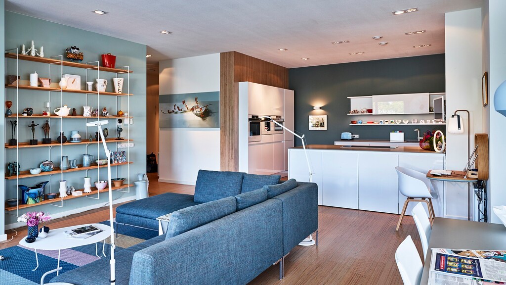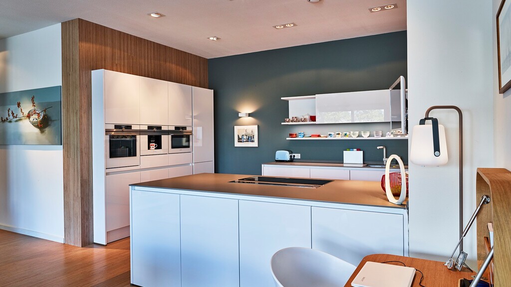 Diese offene Küche mit Halbinsel ist eine Kombination matter Fronten von next125 und Hochglanzfronten von Contur, beide in kristallweiß. Die Arbeitsplatte ist aus Komposit Quarz Form in portlandgrau. Um die hohe Schrankwand herum befindet sich ein hölzerner Umbau, auch Passepartout genannt, im selben Material wie der Fußboden. Die blaugraue Farbe der Rückwand spiegelt sich in den Bildern wider. Das gibt einen besonders schönen Effekt. Die weißen Einbaugeräte kommen von Siemens: eine Kombi-Mikrowelle, ein Ofen und eine Kaffeemaschine. In die Insel ist eine 90 cm breite Induktionsplatte integriert auf der die Töpfe nebeneinander stehen. Dahinter befindet sich ein Siemens Downdraft-Air-Abzugsystem, welches erst aus der Arbeitsplatte herausgefahren wird wenn man es benötigt und nach dem Kochen wieder dorthin verschwindet.