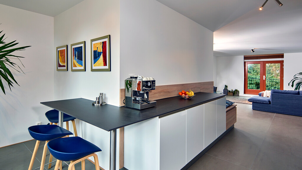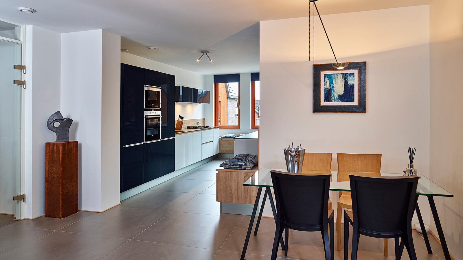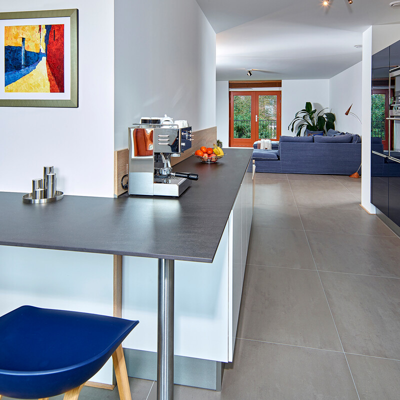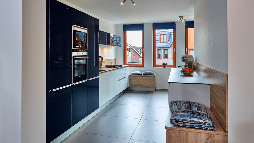 In einem Appartement in der Nähe von Amsterdam montierten wir diese gerade Contur-Küche mit verspielten Details. Der hohe Wandschrank und die kleinen Oberschränke sind in indigoblauem Hochglanzlack ausgeführt, die niedrigen Schränke in kristallweiß. Gegenüber des Küchenblocks befinden sich extra Unterschränke. Die basaltschwarze, keramische Arbeitsplatte läuft um die Ecke durch in eine Tischplatte mit Platz für 2 bis 3 Barhocker. An beiden Seiten wurde ein niedriger Ladenschrank mit Sitzgelegenheit errichtet, ausgeführt in Eichen-Imitat, welches auch als Wandleiste verwendet wurde. Die Küche ist mit Einbaugeräten von Siemens ausgestattet.
