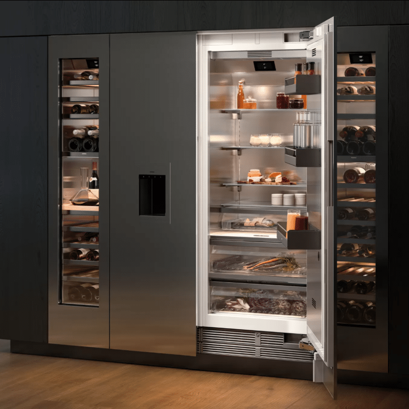 Gaggenau führte das erste Modulsystem von 14 komplett integrierbaren Einbaugeräten ein, die auf viele Art und Weisen zu einer eleganten Kühlwand kombiniert werden können. Die Einrichtungen der Vario Kühlen 400 Serie verfügen über gute LED-Beleuchtungen und Innenverkleidungen aus Edelstahl. Dieses Material ist hygienisch und verhindert die Bildung von Gerüchen.